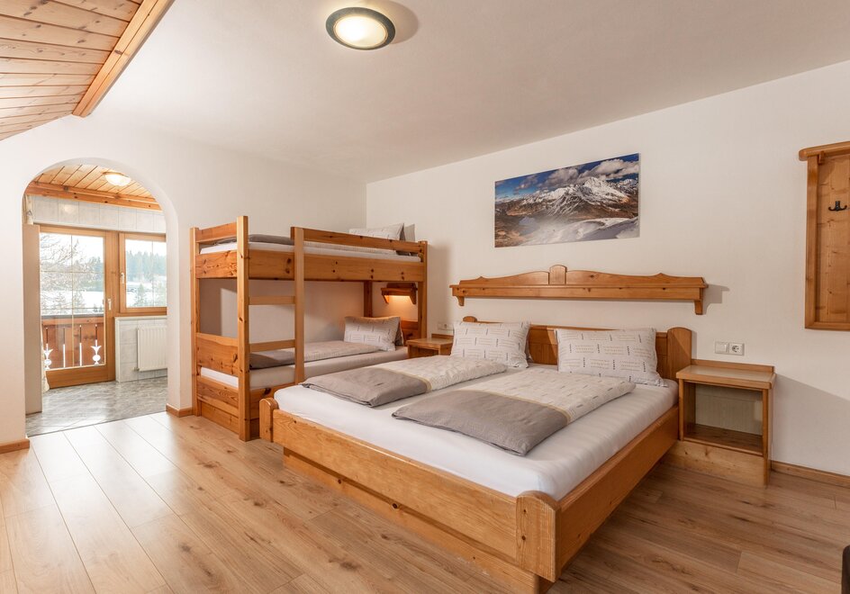 The Pension Wagnerhof offers eight comfortable rooms for 2 - 5 persons and two apartments. Surrounded by the beautiful mountains of the Schladming-Dachstein region, you will find peace and relaxation. Our 8 bedrooms have cozy, self-built beds, shower, toilet, balcony and wlan, with unobstructed views of the countryside. You can choose between two stylishly furnished apartments with spacious living room (with pull-out couch, TV, terrace and wlan), a double room and a triple room. To each of the two bedrooms is a bathroom with shower and toilet. In order to start the day perfectly, we spoil you with a rich and traditional breakfast. As in the morning so also in the evening we enchant you with hearty and grounded dishes in the course of our half-board (no dinner on Sundays).