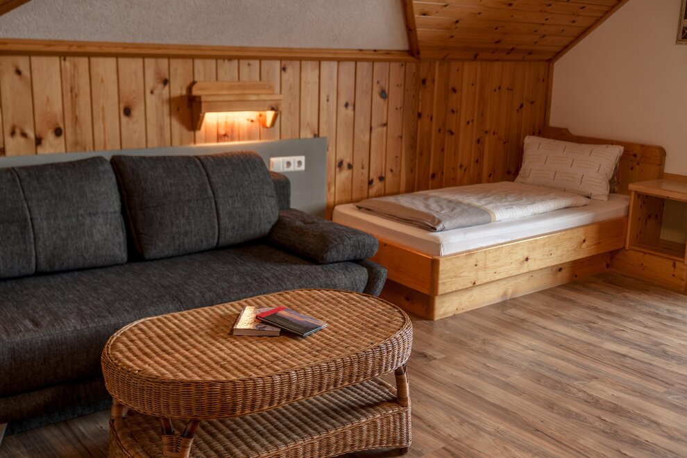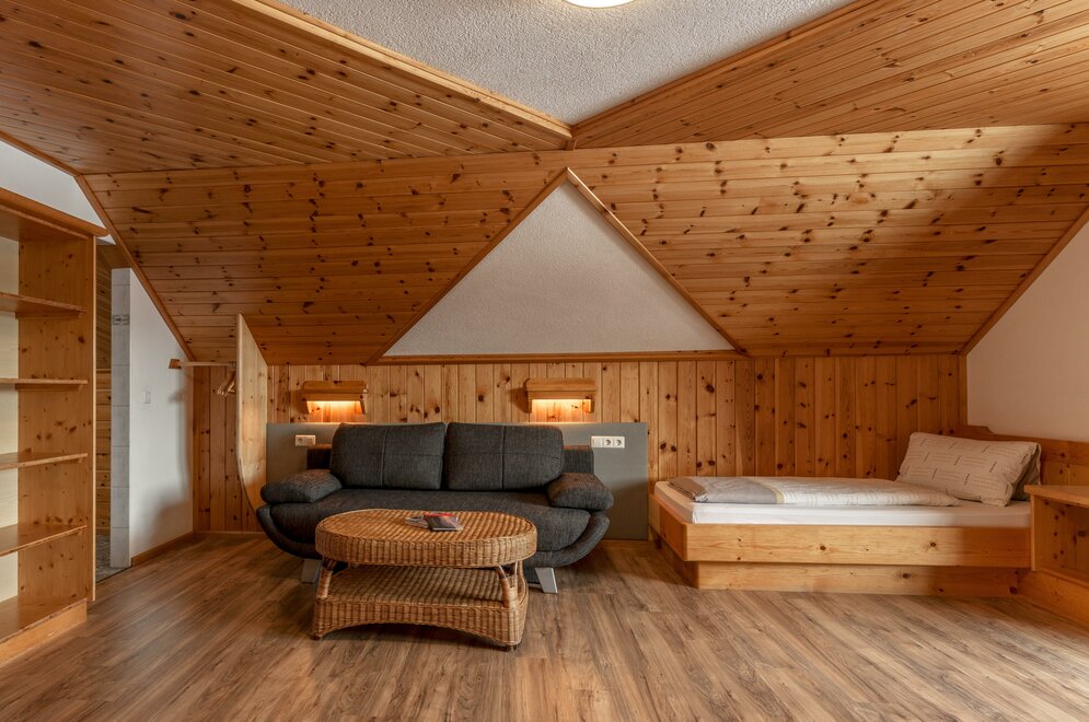 The biggest room of our farmhouse (30m²) is on the 3rd floor with balcony towards east. 1 double-bed, 2 single-beds, couch, shower, toilette. Beautiful view on the landscape of the Schladming-mountains and the Dachstein massif.