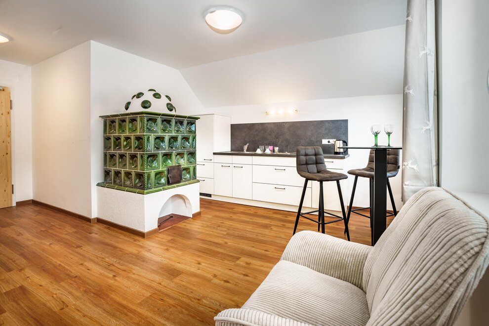 Cosy apartment with double bed, kitchenette, tiled stove, satellite TV, bathroom with shower and WC