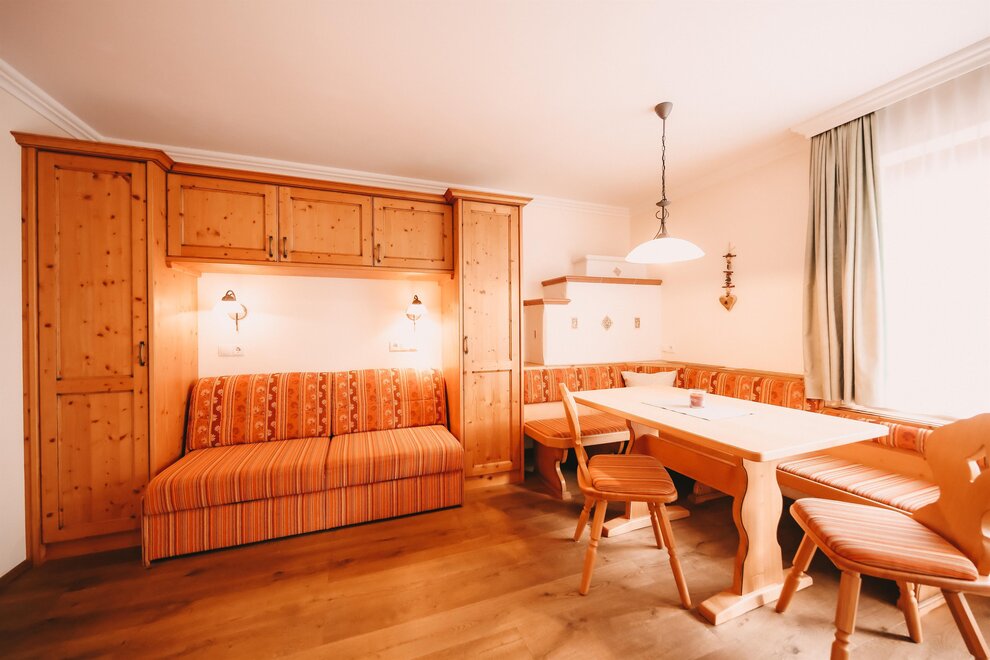 Small studio apartment in the farmhouse with open-plan living/sleeping area, kitchen with dining table and tiled stove. The north/west-facing balcony offers a magnificent view of the Dachstein mountains