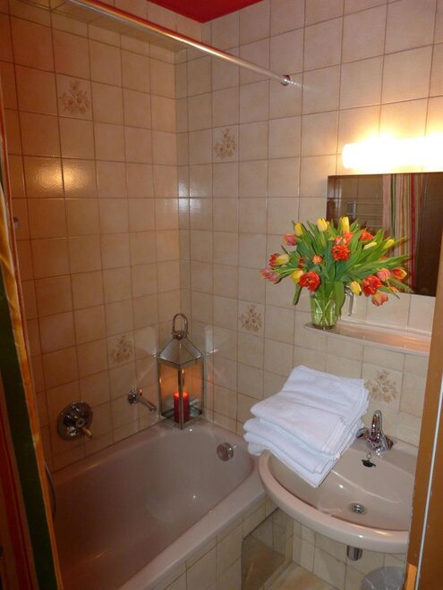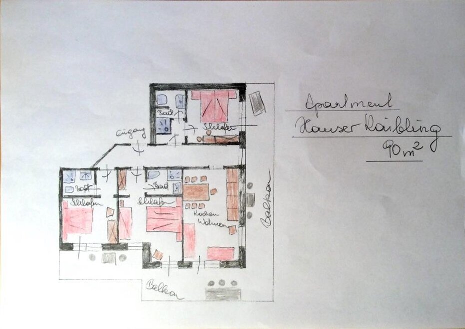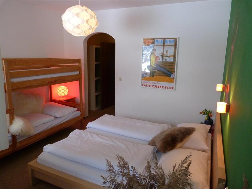 The apartment "Hauser Kaibling" is fancy and colourful equiped. The apartment is suitable for 6 adults or 4 adults and 4 children. The flat consists of 3 sleeping rooms and 3 bathrooms. One sleeping room has addionally a bunk bed for kids. In the living-kitchen room you will find a complettly fitted kitchen with an electric stove, an oven, a refrigerator with a freeze box, a dishwasher, a coffee machine and water cooker and a large dining table. You have a couch corner with flat TV, You have a spectacular view from the apartment to the "Schladminger Tauern" - to our skiing slopes. The bathroom is fitted with a shower and toilette. Enjoy the balcony!