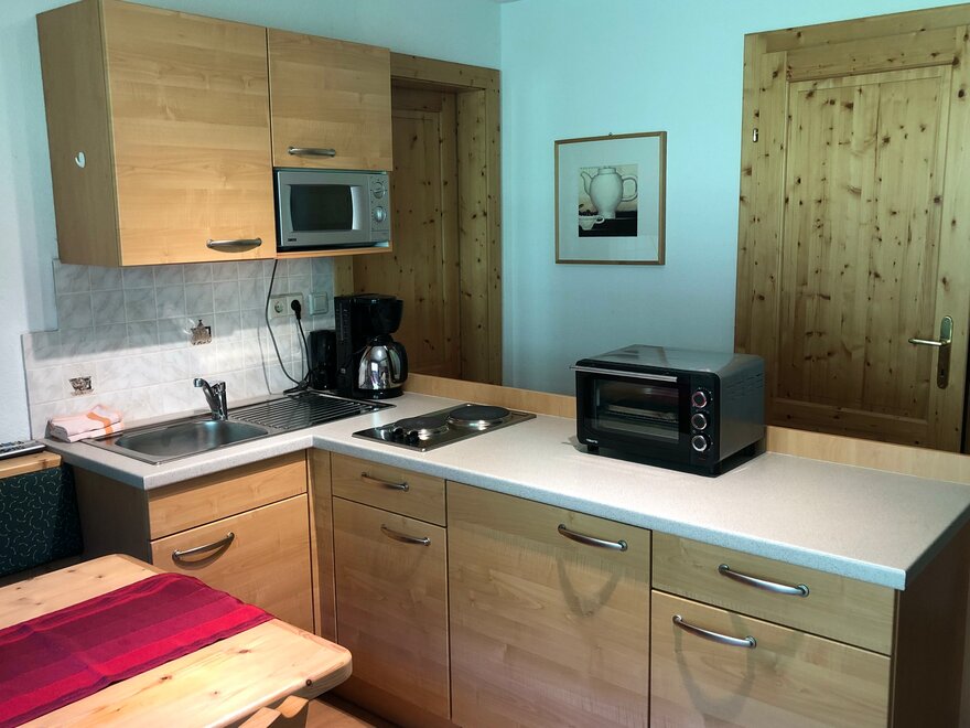 The kitchen is equipped with electric stove, coffee maker, tea maker, fridge, microwave, small oven and other kitchen utensils.