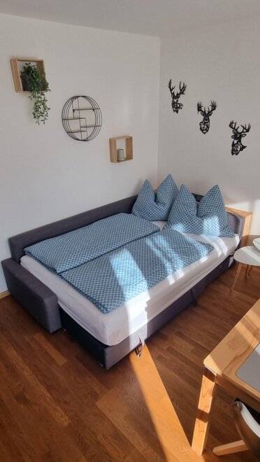 The kitchen with fridge, oven and everything you need for cooking invites you to get creative on vacation. In the open-plan living area, you will find a comfortable couch that can be converted into a sofa bed if required, a cozy dining area and a flat-screen TV.