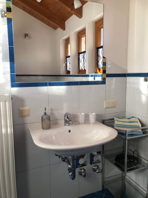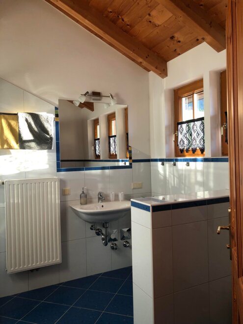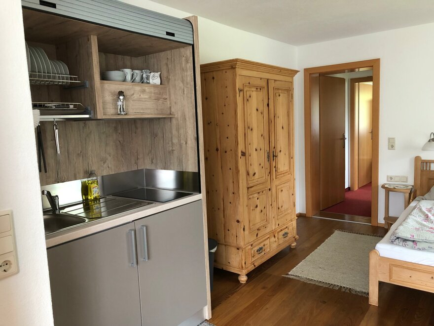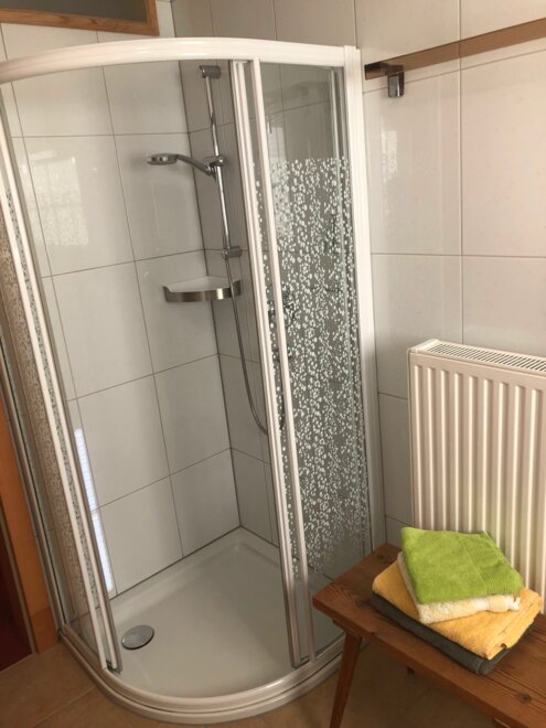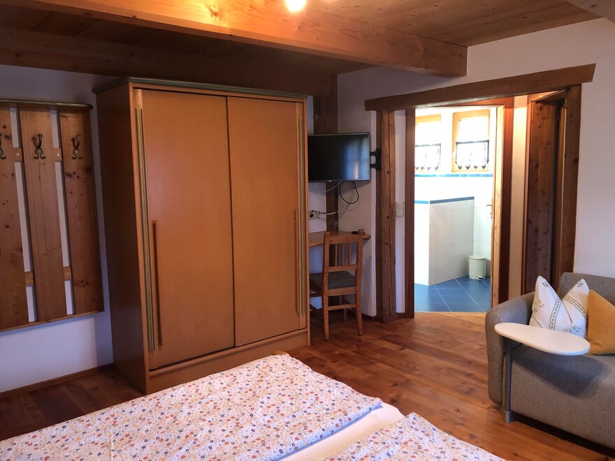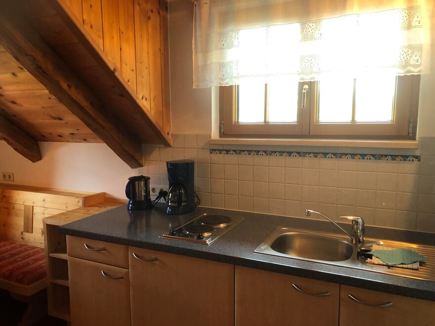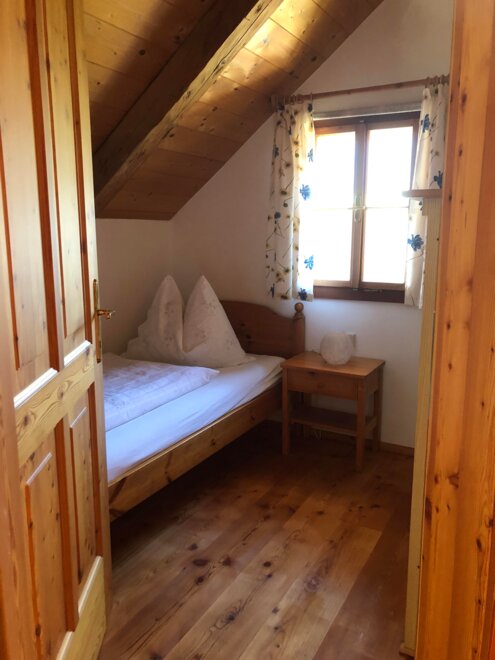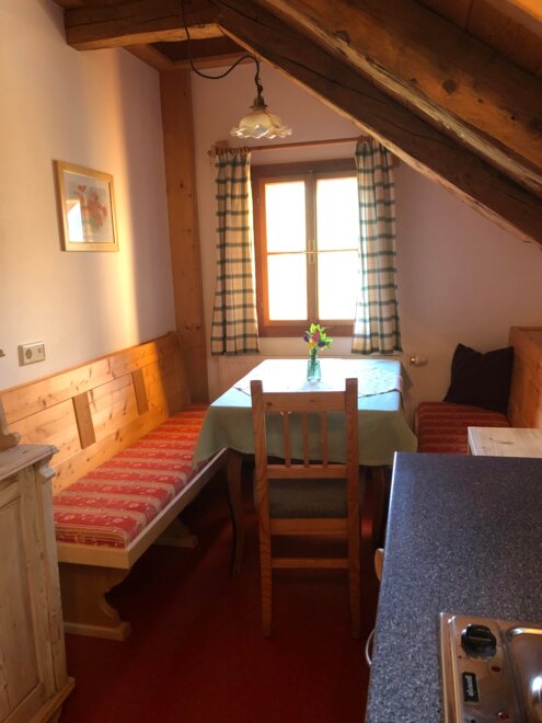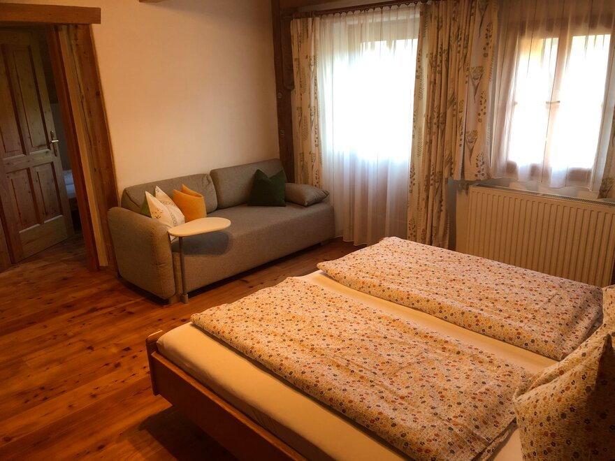 This cozy apartment is located on the 2nd floor of our farmhouse. It is suitable for a maximum of 3 adults or for families with 1 to 2 children. Here you will find a cozy bedroom with a double bed, a sofa bed, and a balcony with a view of the Schladminger Tauern. The second, small bedroom is usually used as a children's room. The bathroom offers all comforts, and in the cozy small kitchen, you can perfectly unwind after a day of vacation. The kitchen itself is equipped with a refrigerator, microwave, toaster, and stove.