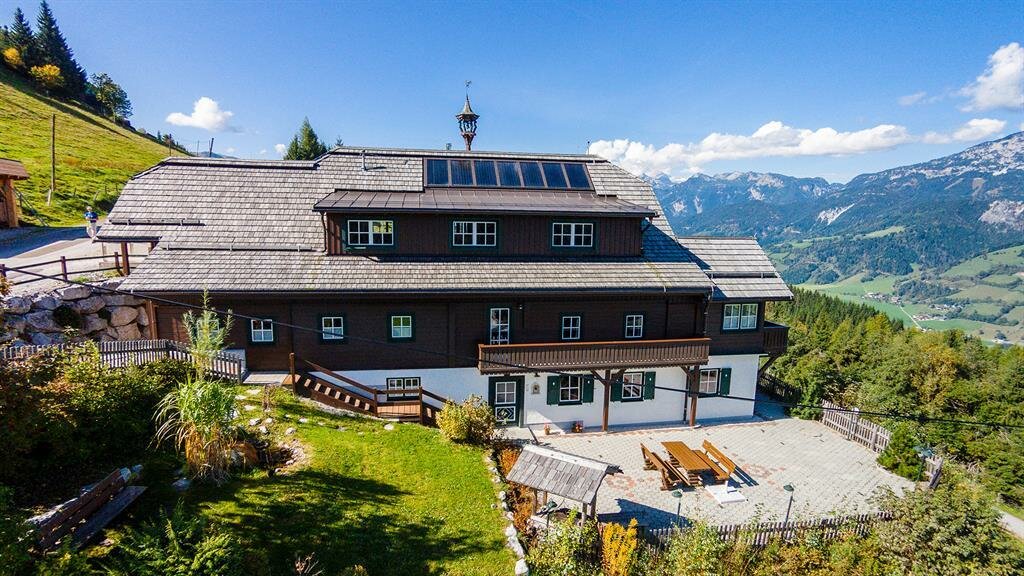 Sonnenalm Mountain Lodge is home to five rustic suites, some with exclusive amenities. This 160-year-old former farmhouse also offers a relaxation room etc. From the Skywalk, our guests have a breath-taking view of Ennstal, one only possible on the Michaelerberg from the Sonnenalm, very much the “balcony of Ennstal”. If you wish to experience a mountain summer in its magnificent colour, the Sonnenalm at 1200 metres above sea level is an ideal base for hiking, mountain biking, running, Nordic walking, paragliding, rafting, riding, high ropes etc. Winter sports fans can choose between different ski areas, some of which are family friendly.