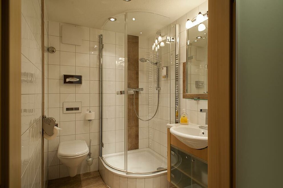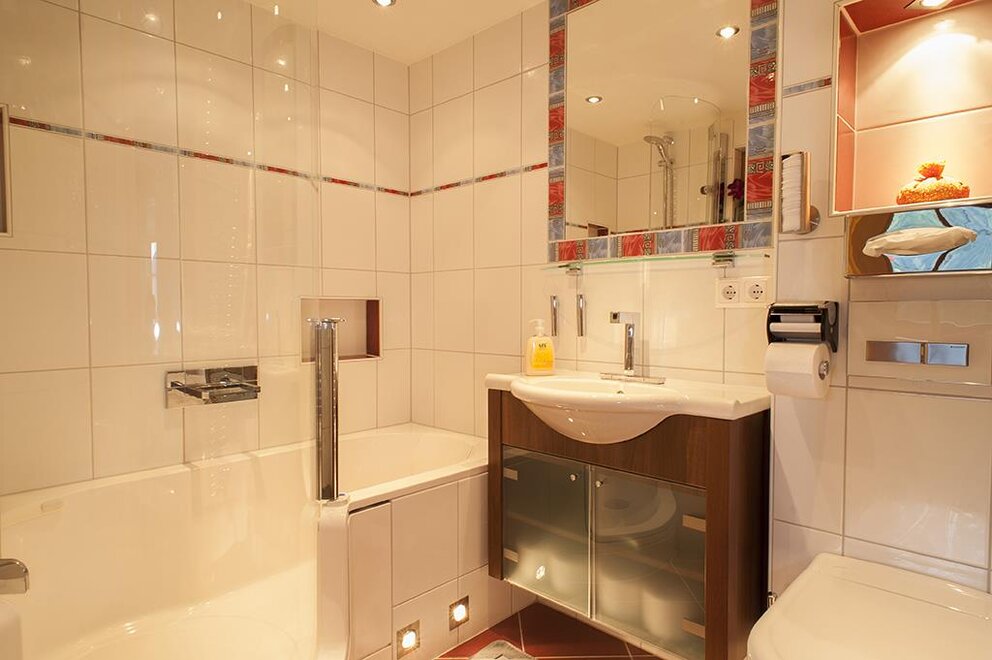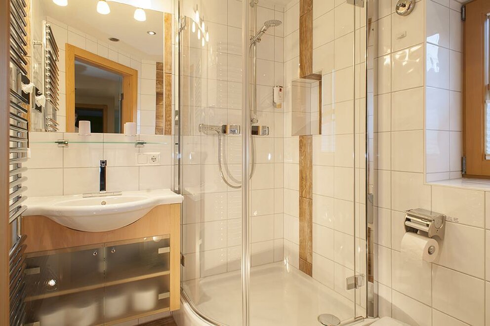 The high-quality features of the "Alpenrosen" suite also include the modern bathroom with shower, toilet, sink, a radiator as a towel warmer, and extraordinary fittings.