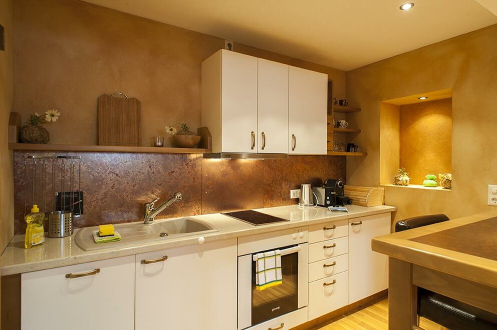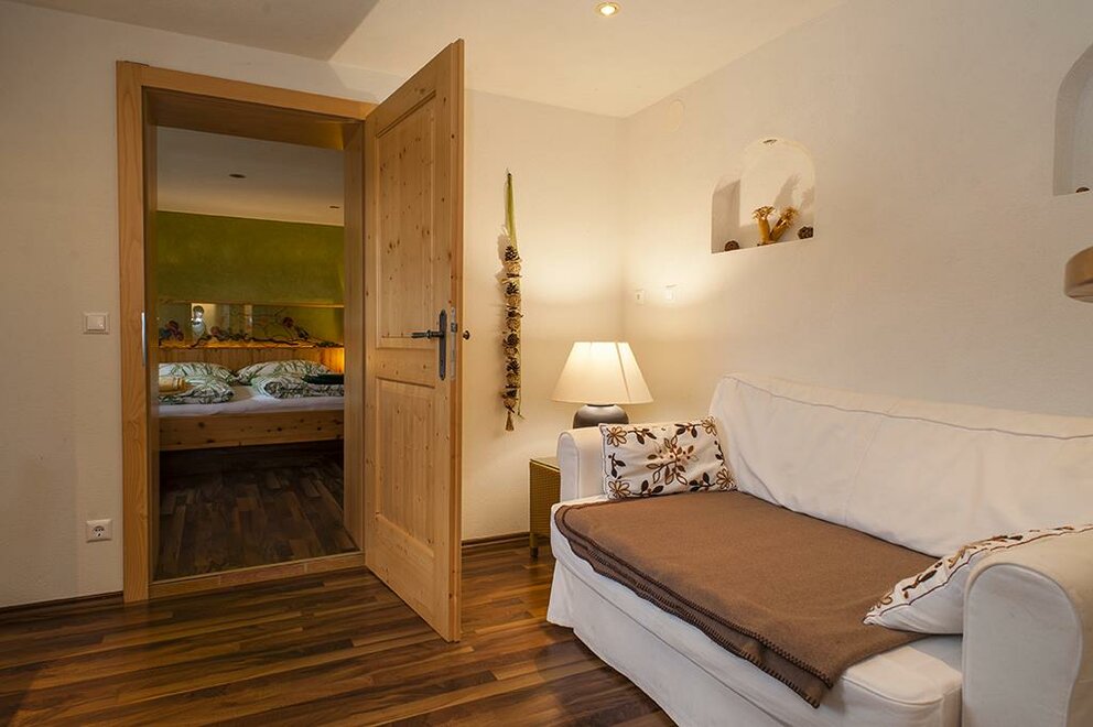 Our rustic holiday apartment "Bergkristall" offers space for 2 persons (25 sqm) and is located on the ground floor. The living and dining area with integrated open kitchen is equipped with modern technology: The kitchen includes all standard electrical appliances up to the Nespresso coffee machine - in the living area, there is a flat-screen TV with DVD player, etc. The cozy double bed invites you in the sleeping area. The high-end amenities of the "Bergkristall" suite also include the modern bathroom with shower, WC, sink, a radiator as a towel warmer, exquisite fittings with lighting effects, as well as rustic wooden tiles. Guests of our holiday apartment "Bergkristall" have access to the large wellness area on the ground floor at any time. The "Waschkuchl" is available on the ground floor for laundry washing.