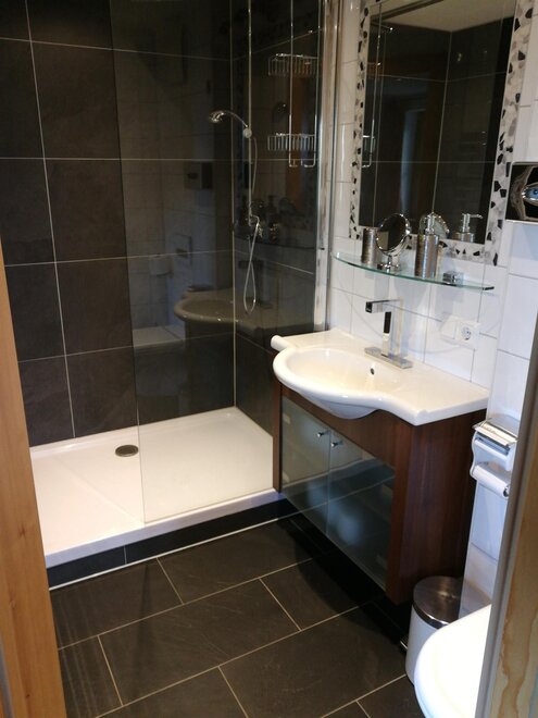The upscale amenities of the suite “Bergjuwel” also include a luxurious bathroom with bathtub, experience shower, double sink, toilet, a radiator as a towel warmer, etc. Wellness area on the ground floor.The holiday apartment in country house style with its own ground floor entrance is designed for 2 - 6 people (120 sqm) and offers two separate bedrooms. Large balcony with panoramic views. The high-quality living and dining area with an open, fully equipped kitchen features a fireplace. Entertainment is provided by a 50" satellite TV with a BlueRay player and an internet radio. Wi-Fi is available in all rooms.