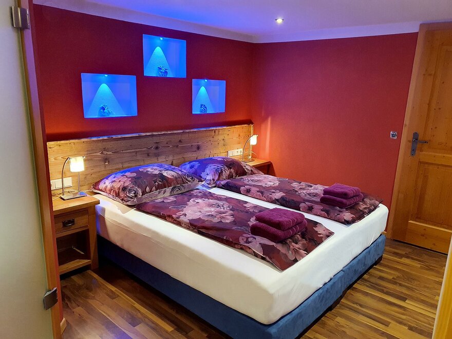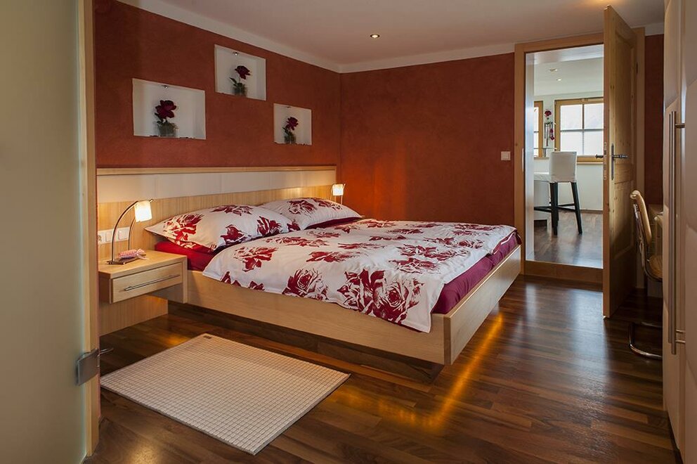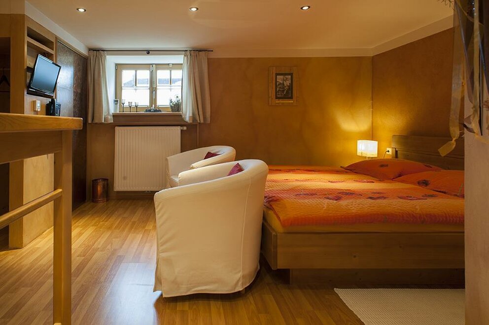 The bedroom is furnished with a romantic double bed, the bathroom with high standards: combined shower/bathtub, toilet, sink, radiator as a towel warmer, and extraordinary fixtures. In the wellness area, there is a Swiss stone pine and old wood sauna, infrared cabin.Room/apartment features