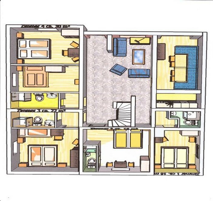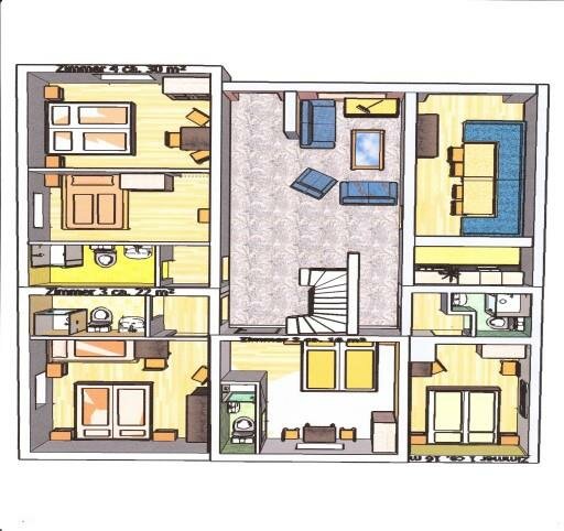 Our apartment for 6 - 10 people has 4 separate bedrooms each with private bathroom, a fully equipped kitchen (stove, dishwasher, microwave, coffee maker and much more) with a cozy dining area. In each room you will find a private television (satellite TV). In the apartment you have free wi-fi.