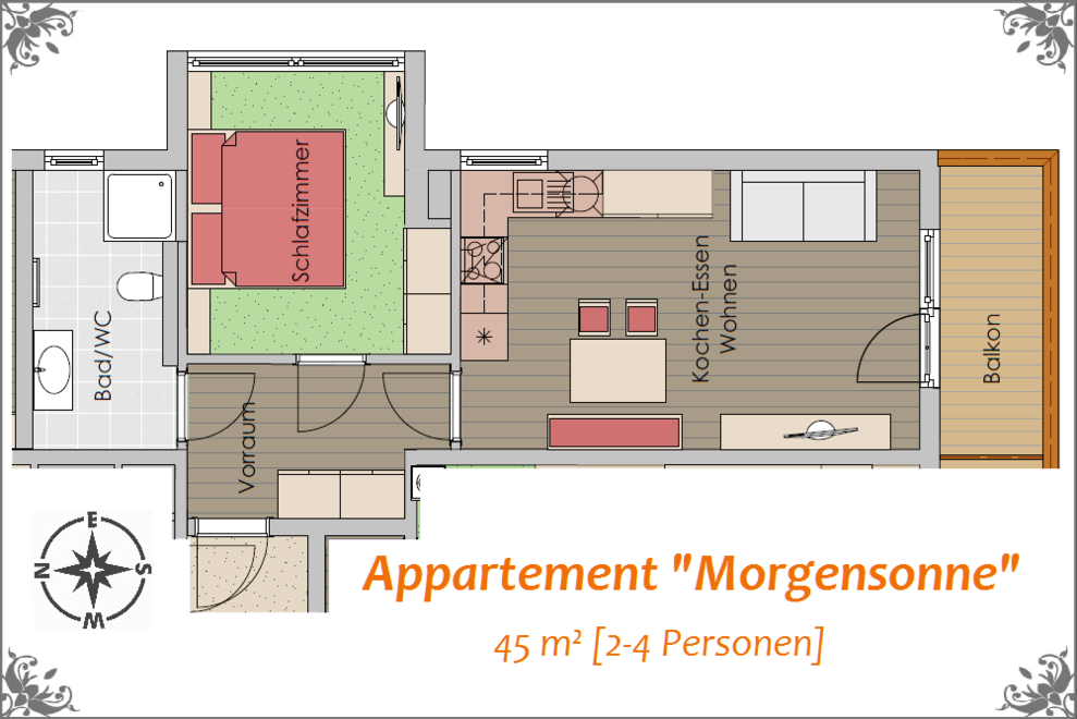 Our apartment "MORGENSONNE" measures 45 m². It offers 1 cozy bedroom with top furnishings, bright, modern and spacious bathroom with shower and toilet. Fully equipped kitchen with tasteful living room which invites you to linger. South facing balcony with panoramic views of the Schladminger Tauern. Standard Occupancy: 2 people, maximum 4 people (sofa bed)