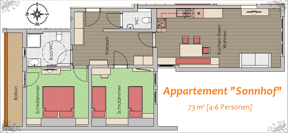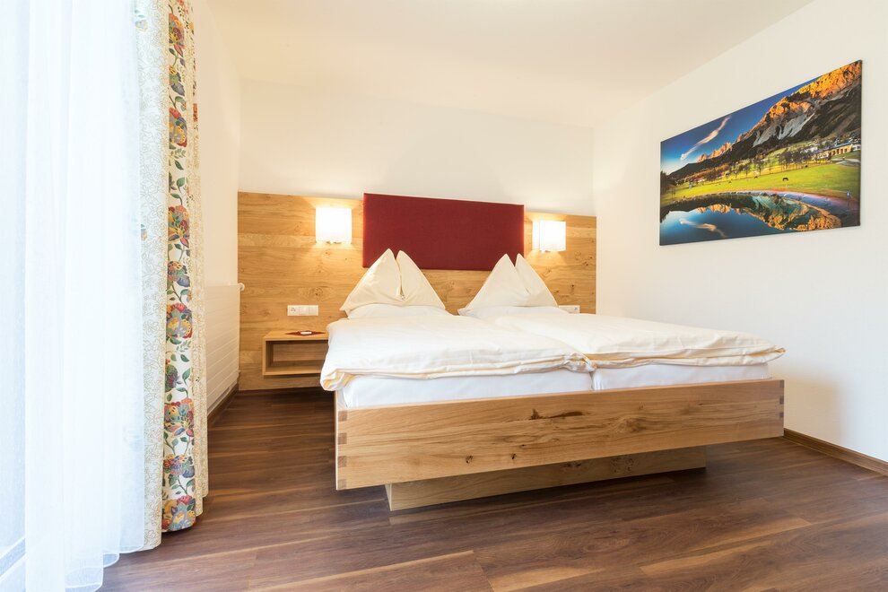 Our apartment "SONNHOF" with 73 m² is a spacious, cozy apartment where you can enjoy a wonderful holiday. 2 separate bedrooms (one with sliding bed), large, wheelchair-accessible bathroom with walk-in shower/toilet. Additionally, 2nd toilet in the hall. Fully equipped kitchen with spacious living room. Balcony overlooking the Dachstein. Standard occupancy: 4 persons, maximum 6 persons (sofa bed)