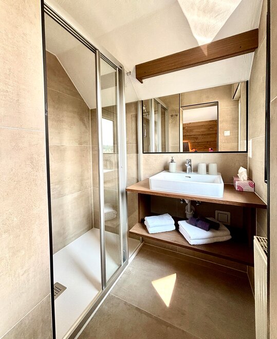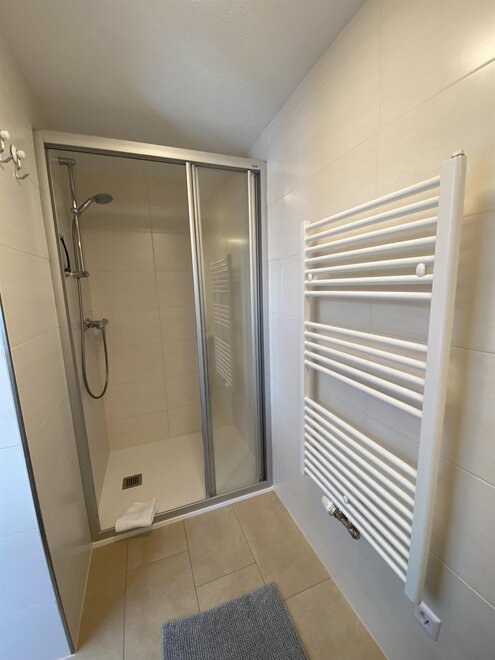 Bedroom with shower / WC and east balcony, towels and hair dryer.