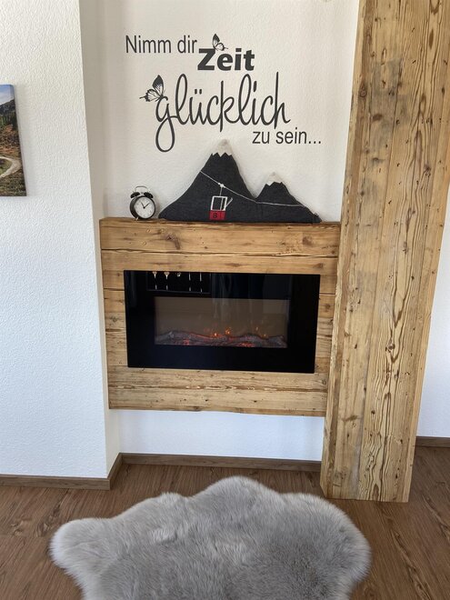 Totally newly renovated apartment, kitchen and living room open, electric fireplace and couch.