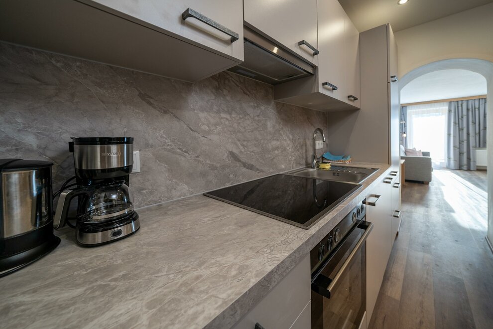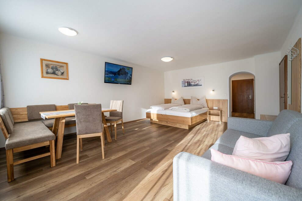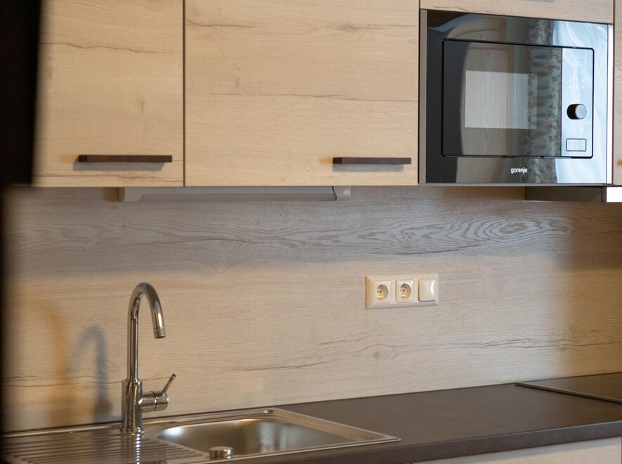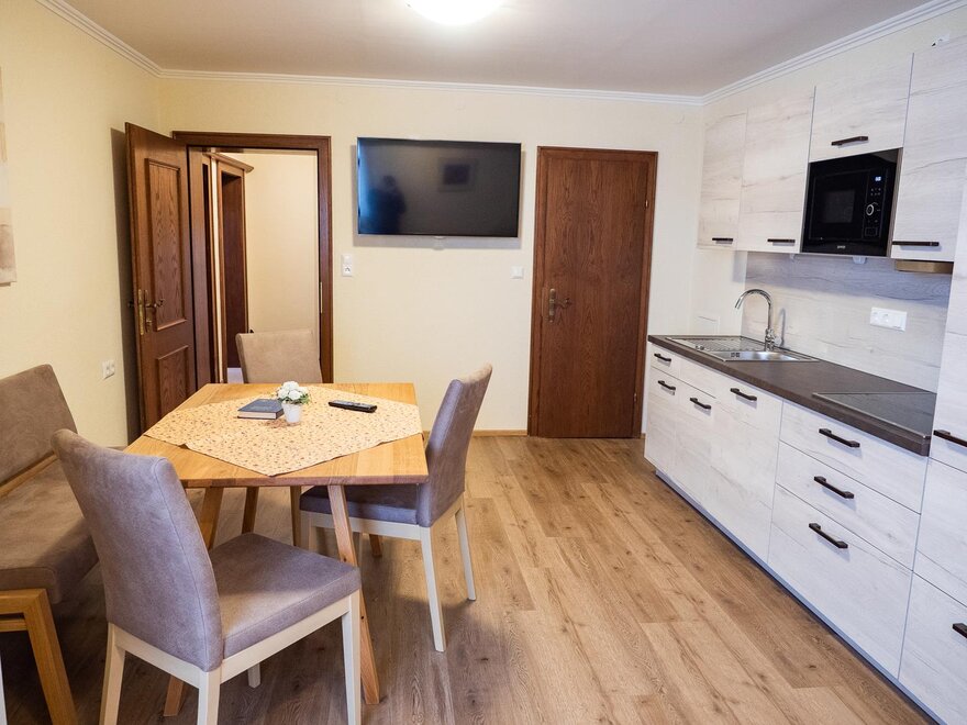 The Studio Planai has a living-sleeping area with double bed and cozy dining area, kitchenette with microwave, electric stove, refrigerator, dishwasher, 1 bathroom with shower / WC and south-facing balcony.