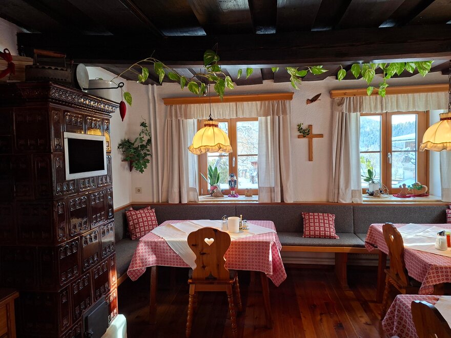 In the cozy farmhouse parlor with a tiled stove, we gladly pamper you with a rich, healthy breakfast including a muesli corner, homemade Sunday cakes, fresh garden fruits - depending on the season... and a soft-boiled egg on request...