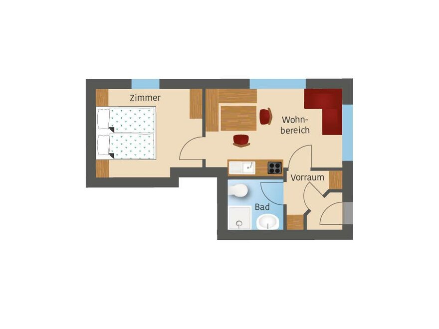 cooking possibilities, kitchenette, dishes available, radio, towels available, cable TV, coffeemaker, TV, refrigerator, non-smoking room/apt., combined bedroom/living room, separate bedroom/living room, dish sink, rustic furniture, garden furniture, Größe m²: 30, electric stove, bed linen available, furniture suite