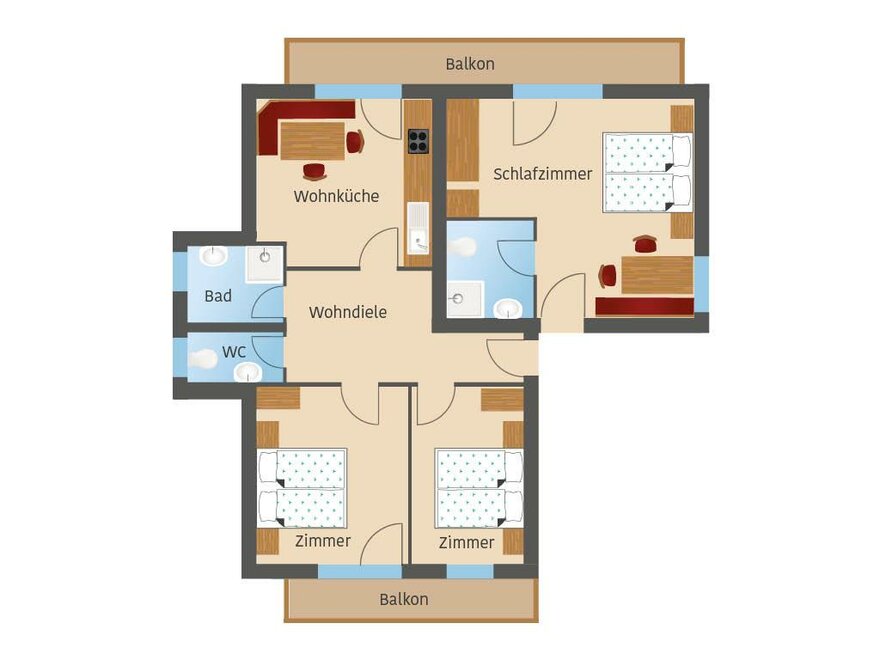 Size 95 m² Occupancy 2 - 6 adults , 0 - 4 children Rooms 4 Bedrooms 3 Room details
