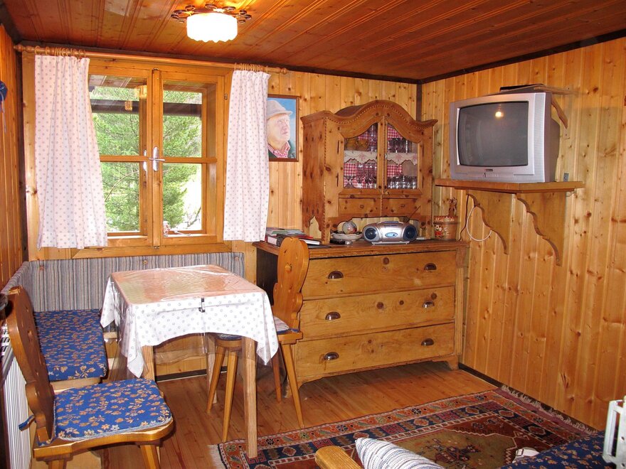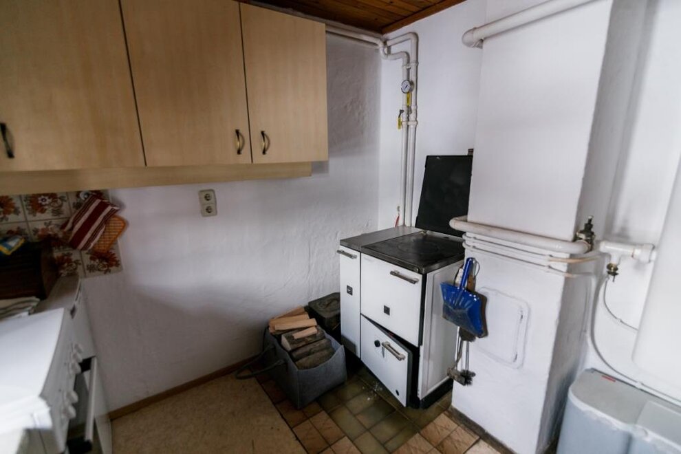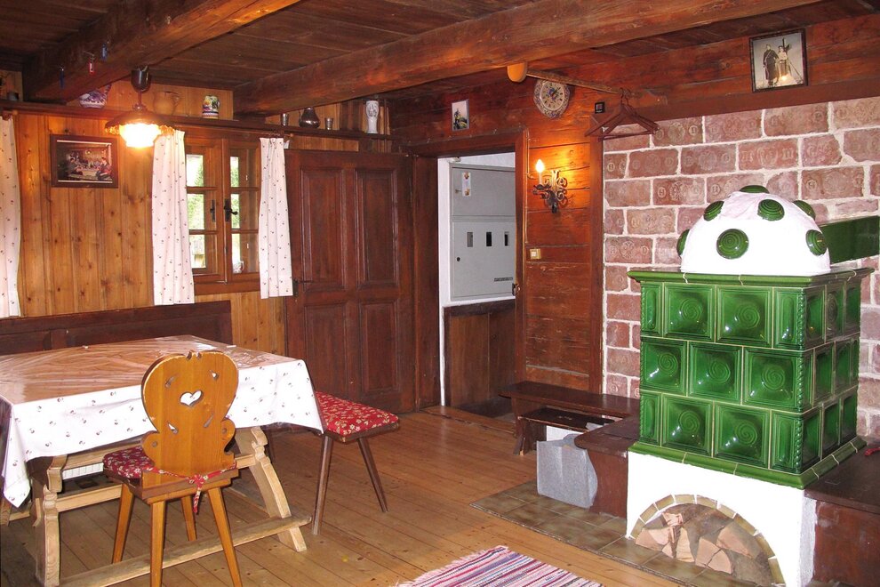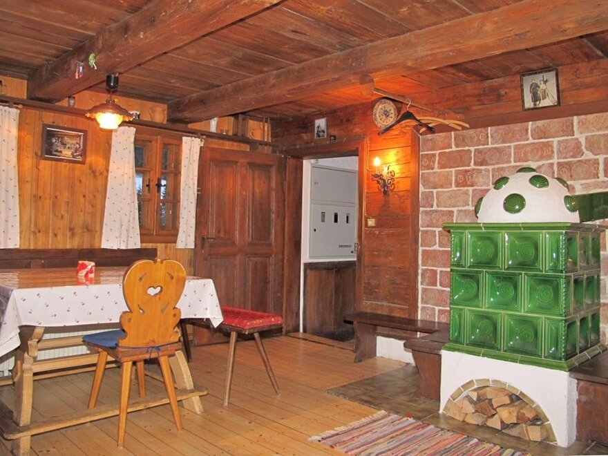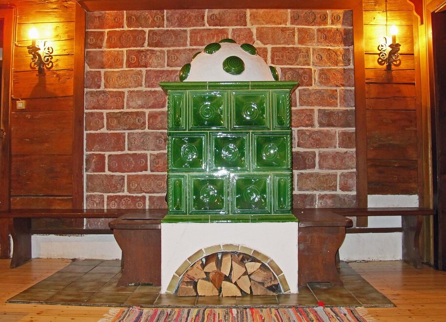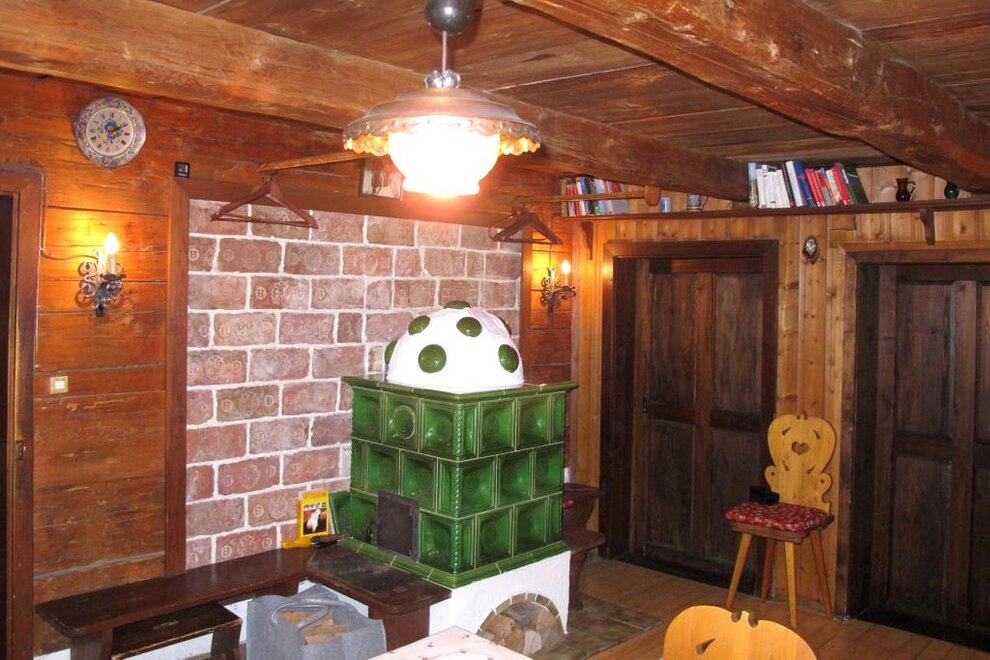 Cozy living room with tiled stove and old farmhouse furniture. Private TV or children's playroom.
