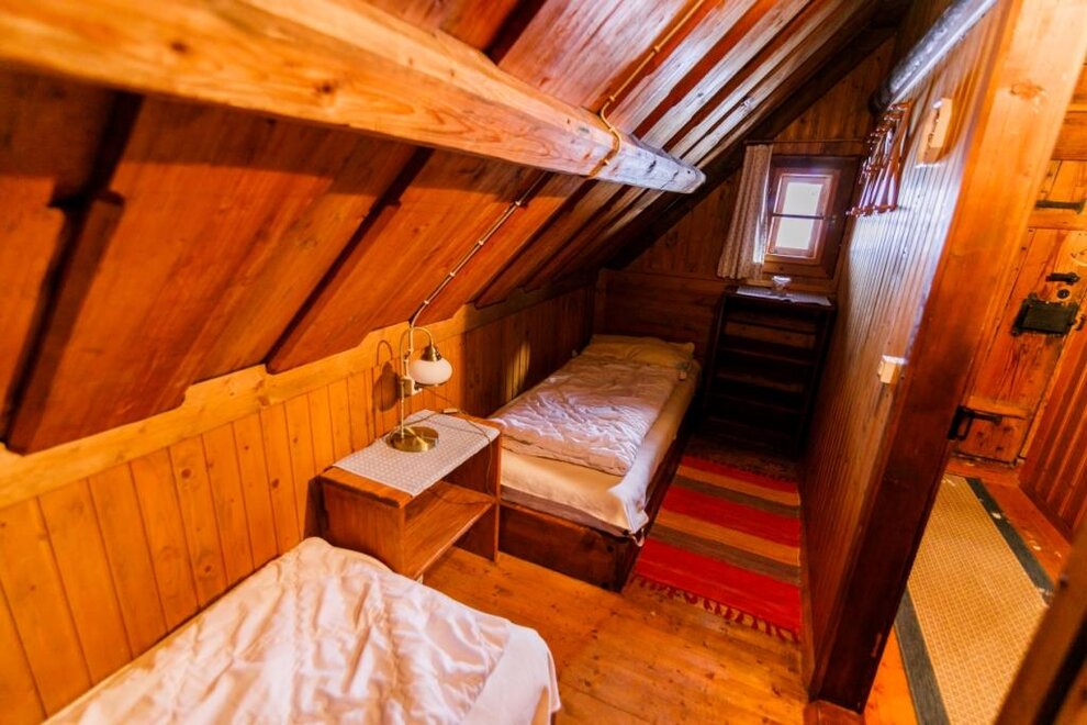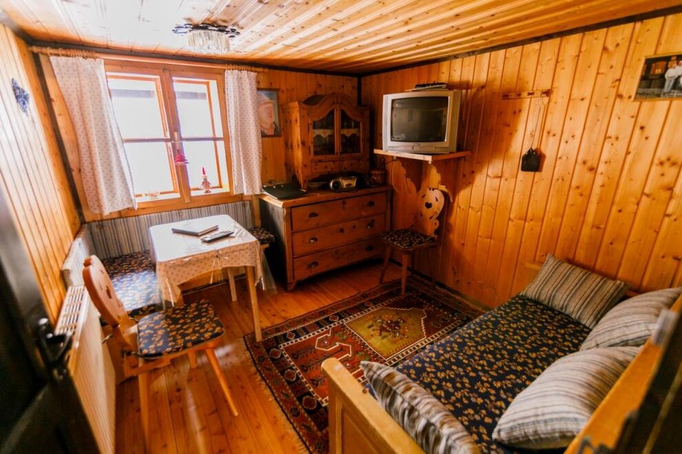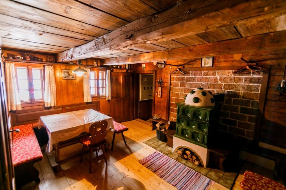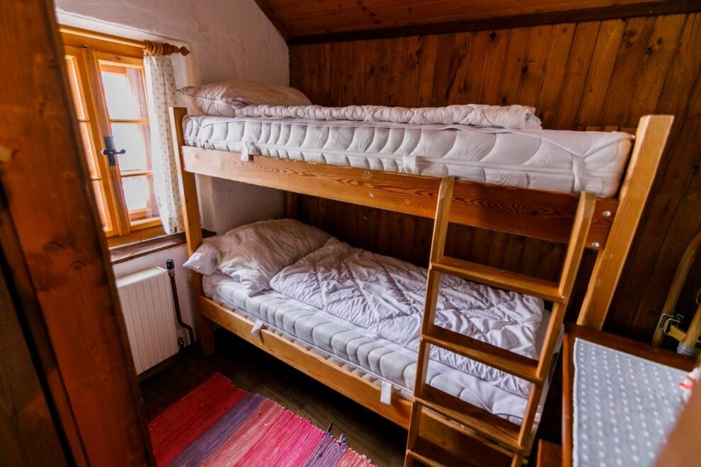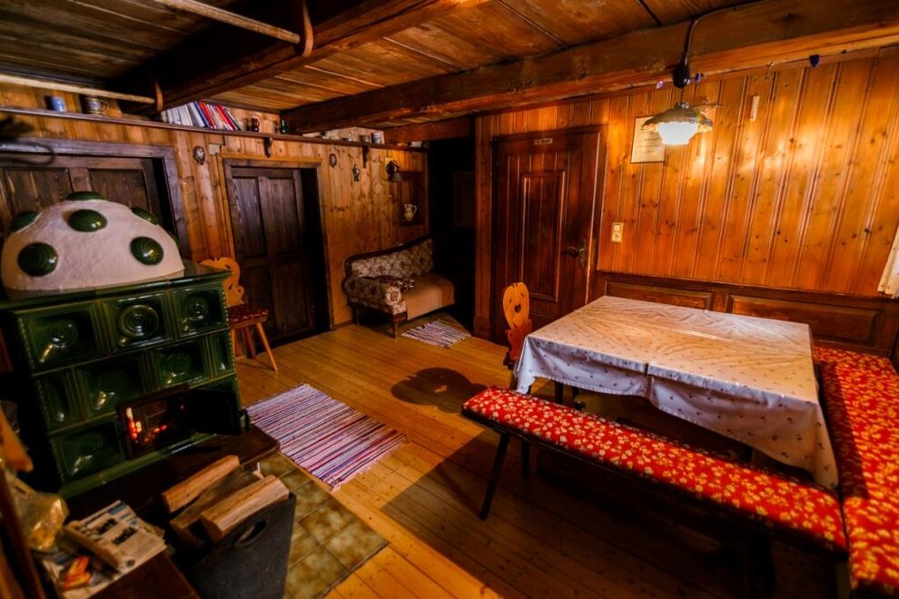 Cozy living room with tiled stove and old farmhouse furniture. Private TV or children's playroom.