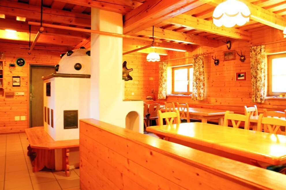 Scharlinger Alm for up to 20 people: self-catering hut right on the slopes with panoramic views / 7 bedrooms (3 twin rooms, 1 triple room, 1 four-bed room and 2 mattress dormitories) / large cosy living room with wood-burning stove / fully equipped kitchen with fridge and freezer, gas stove with oven, table stove, dishwasher, coffee machines / covered terrace with barbecue facilities / shoe and ski room