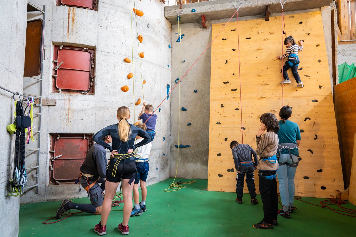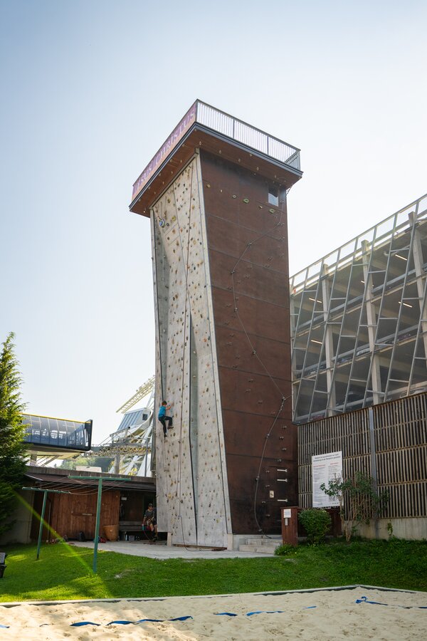 Well equipped with a climbing harness and helmet, roped up and professionally secured by a mountain guide, the first holds and steps are tried out on the 9 metre high climbing tower. The necessary equipment is provided.
