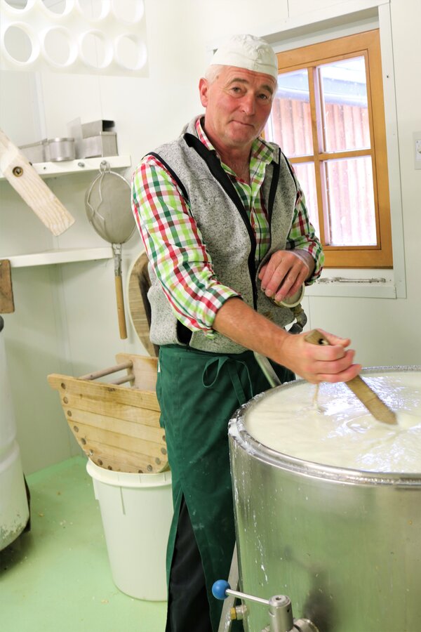 The Ilsinger family is also familiar with the authentic Alm lifestyle. They run the Schrabachalm in Donnersbach and continue to produce original Ennstaler Steirerkas using traditional methods. Hans, head of the family, is mainly responsible for the cheese production, while son Hannes and his wife Christina took over the family business in 2020. If you peek for a moment over Hans’s shoulder in his cheese-making room, it quickly becomes clear that he invests a lot of passion and appreciation in the food he produces. " Ennstaler Steirerkas played an important role in the region between Eisenerz and Schladming. Hundreds of years ago, it wasn’t possible to cool milk, so a way had to be found for preserving it," explains the history buff. Since fat was essential for survival in a population that had to cope with hard physical work, butter was an important food. So, the cream was separated from the milk for the butter, and the by-product - the skimmed milk - was used to create the Steirerkas. "This lean cheese could be stored for months without any problem and was often used as a vital reserve during food shortages. In addition, Steirerkas was particularly nutritious for miners in the mining industry, which was widespread in our region back in the day," says Hans, talking extensively about the history of this local dairy product that is also readily digestible and promotes a healthy gut. He is proud to have maintained the original production process and to make the cheese essentially the same way as 300 years ago - only with a few technical advancements.