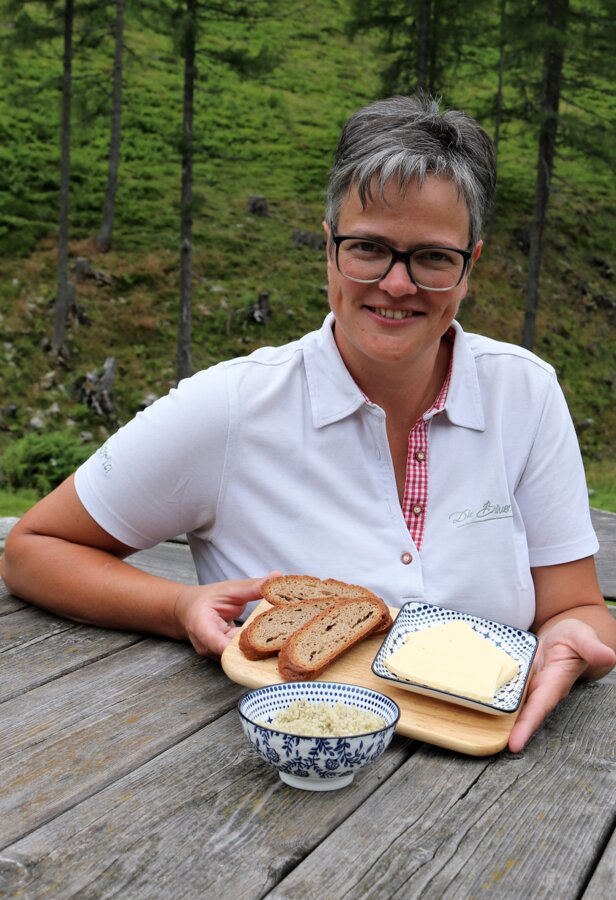 After milking, the milk is separated into cream and skimmed milk in a centrifuge. The cream is turned into butter there at the Schrabachalm. The skimmed milk, on the other hand, is allowed to sour naturally before being boiled in a kettle. Hans explains, "The cooked low-fat curd now has the crumbly consistency that gives the Steirerkas its typical appearance. It is seasoned with salt and pepper, which preserves it, pressed into molds, tipped out onto wooden boards, and allowed to mature at room temperature." Looking into the maturation room makes your mouth water: balls of cheese in various degrees of maturity are waiting to be crumbled again and land on a slice of bread. "Ennstaler Steirerkas matures for at least six weeks. Then I take it to the hut kitchen to my hardworking wife Birgit, and she serves it to hikers from all over the world who relish its unique taste," adds the cheese expert. In the summer months, the two owners of the shared grazing area have a total of 50 cattle, 20 sheep, and 20 goats at pasture. Eighteen dairy cows are milked daily to produce mouthwatering products. "What many people don't know is that it takes about 10 liters of whole milk to produce 1 kg of hard cheese, and about 22 liters of whole milk to make 1 kg of butter. That's why we're particularly happy when guests really appreciate our products and the work we put in here at the Alm," concludes Hans, looking forward to the upcoming summer on the Alm and the first bread with fresh, crumbly, yellow-greenish-gray Ennstaler Steirerkas!