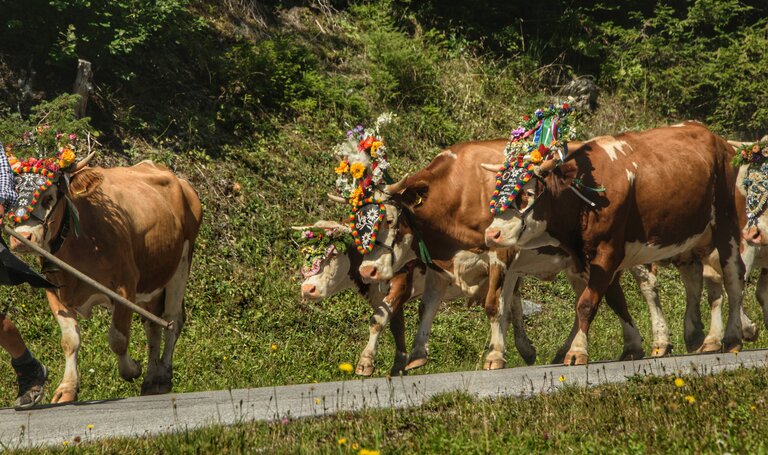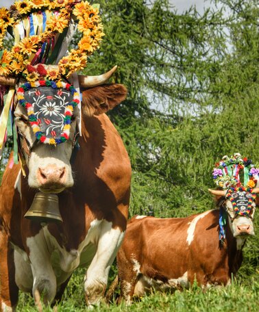 The bell cow leads the herd with her owner. It is decorated with a neck wreath, a forehead wreath and the so-called “horn chimney”. All other cows receive forehead wreaths. At the end of the procession is the dairymaid, who treats the spectators along the way with specialties. These traditionally include the Raungerl, which are small cubes of shortcrust pastry that were baked in hot fat until golden and then rolled in cinnamon and sugar.