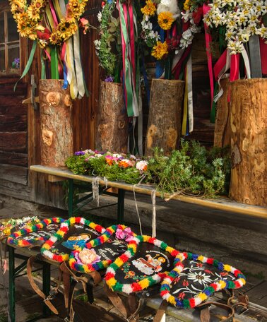 On the day of the cattle drive, the “wreathing” begins early in the morning after milking, including on the Walcheralm at the foot of the Dachstein. As long as the summer has been accident-free and all animals return safely to the valley, the cows will be decorated with lovingly made colorful flower wreaths, ribbons and signs to celebrate the day. In order to send a sign of mourning, in the event of a loss or death, colorful jewelry is avoided and the jewelry is kept dark.