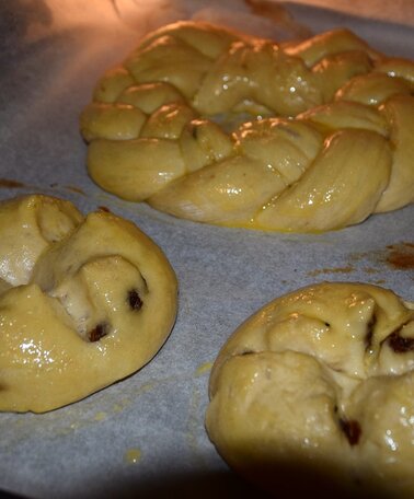 5. Now our Easter Pinzen can be brushed with egg and sprinkled with granulated sugar if desired. Just like for us, our tweezers also have to keep their distance from the baking tray, as the dough will rise during baking. Bake the Easter pinzen in a preheated oven at 180 degrees for 10 to 15 minutes until they get their golden brown color. A wonderful smell of fresh pastries makes your mouth water!