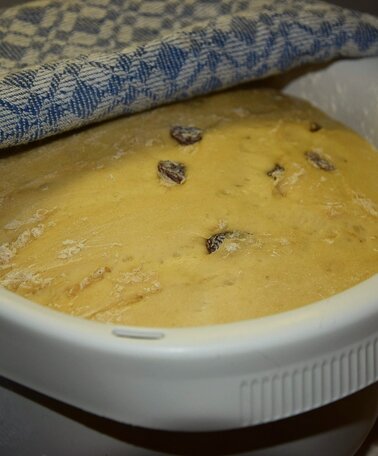 3. After the steam has risen a little, it can be added to the flour and worked into a smooth dough together with the butter-milk-egg mixture and raisins. If the mixture is a little too sticky, you can help with a little flour. Our dough now has to rest for an hour.