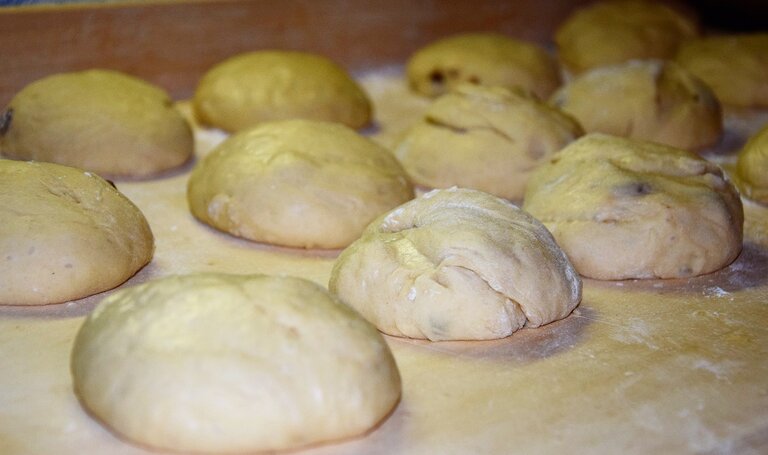 4. As you can see in the picture below on the left, our dough has now doubled in volume and is ready for further processing. Now we will form balls, each weighing around 100g, before we cut them three times deep in the middle so that they get the classic shape of the tweezers.