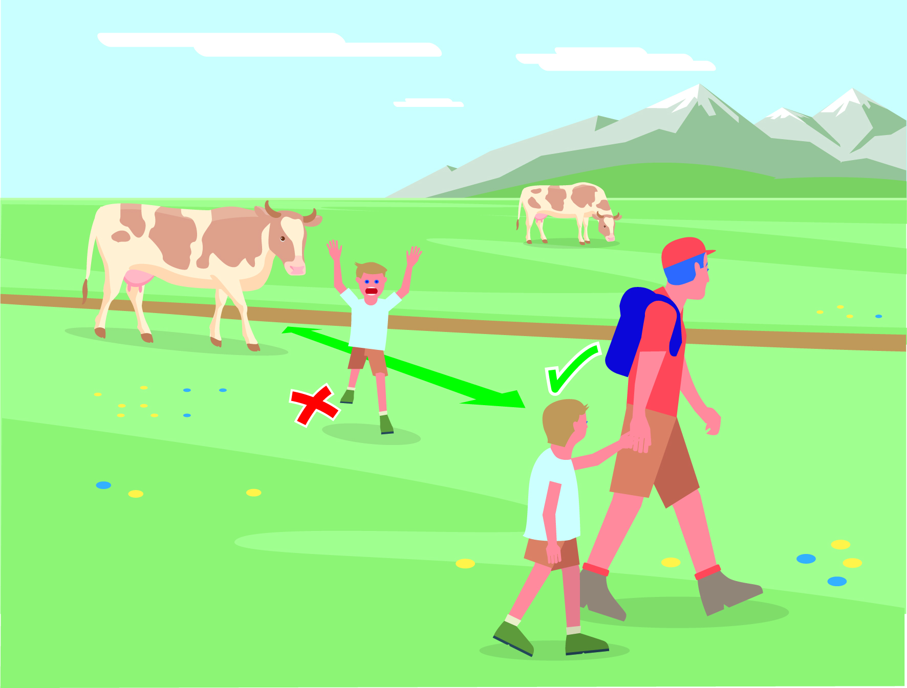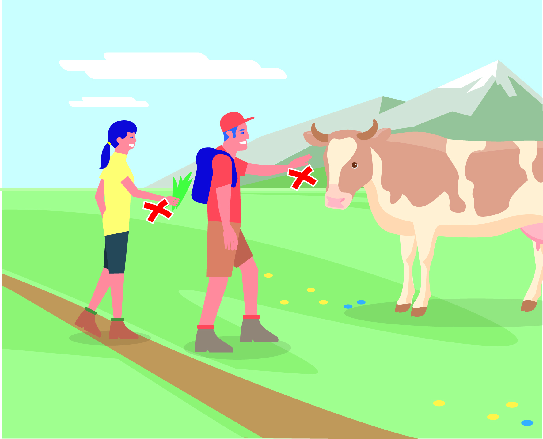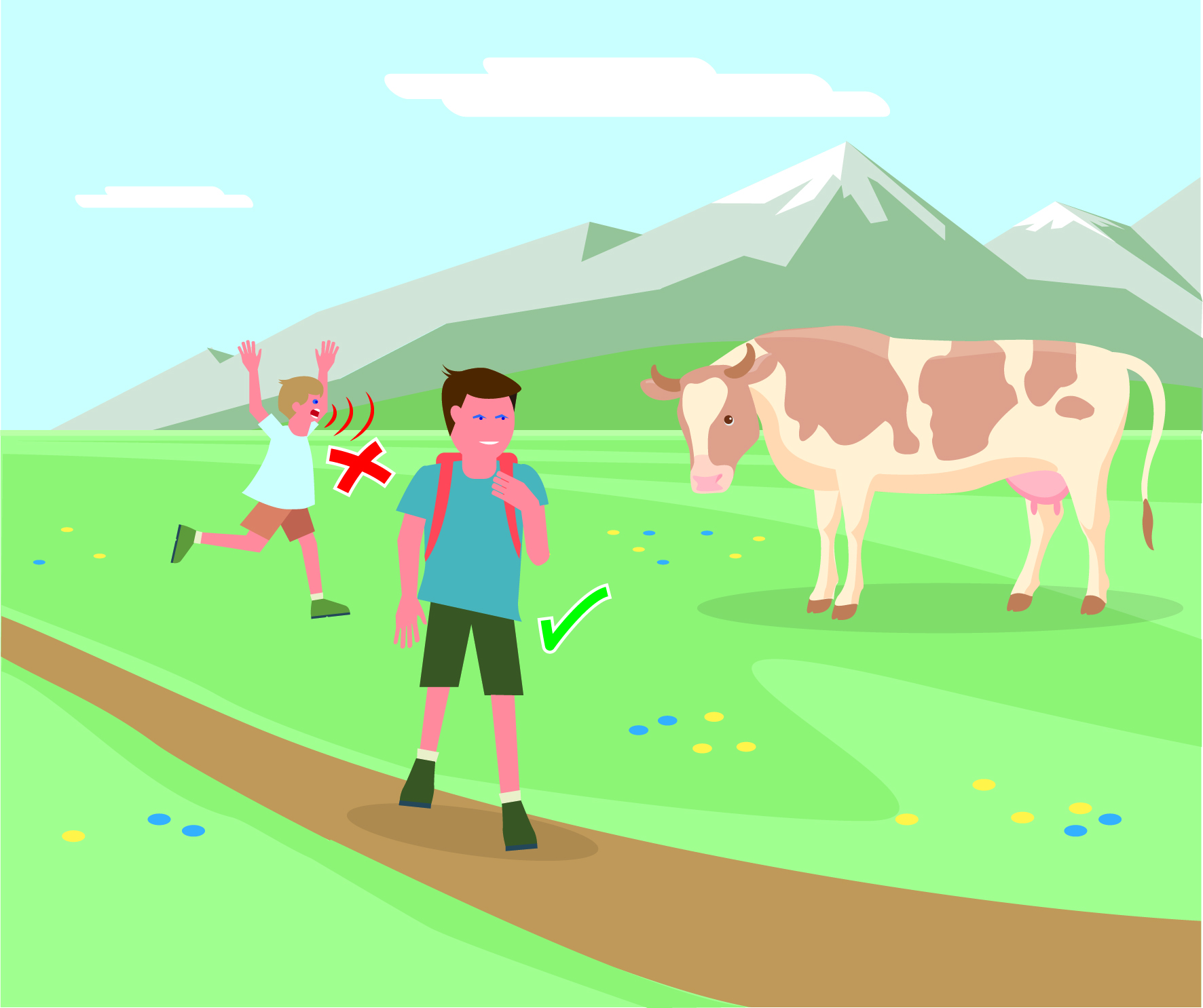 On alpine pastures, as a rule you should always remain quiet and not scare the grazing animals. Avoid contact with the animals and do not try to feed them! Do not make hectic motions and, above all, never try to mimic “cow noises”.