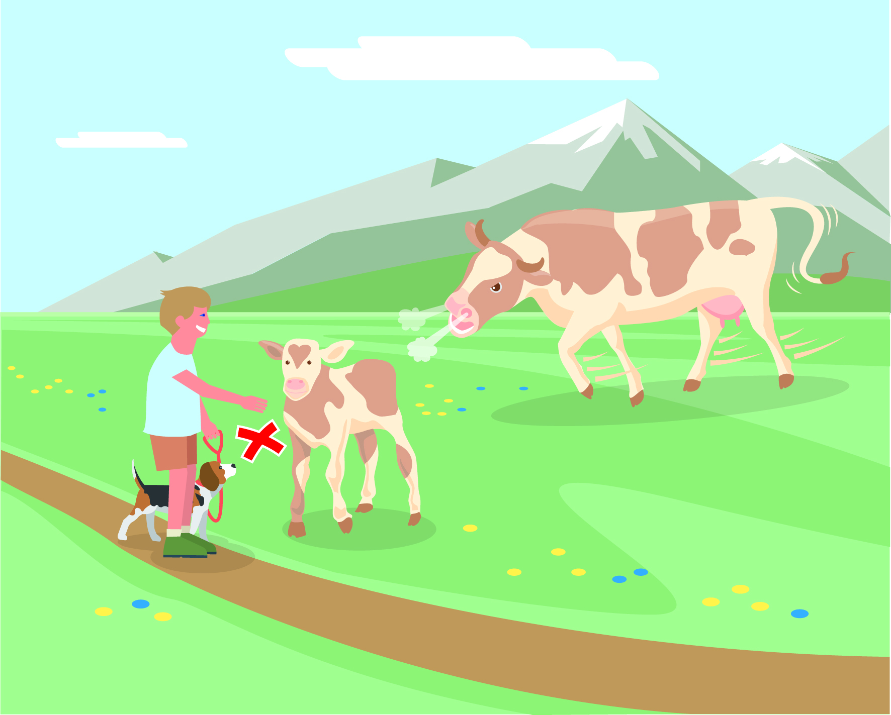 As a matter of principle, you should always treat nature, animals and the people who work in the countryside with respect and appreciation. Farming the fields and especially the alpine pastures is often done in difficult conditions. Show your respect for this important and hard work. To avoid unpleasant encounters with the grazing animals, please obey a few basic rules. In particular, realize that cows, especially mother cows, view dogs as potential enemies and will always protect their calves. The following behaviors will ensure your personal safety and guarantee that you behave correctly on the meadows and alpine pastures that provide a home for our cattle.