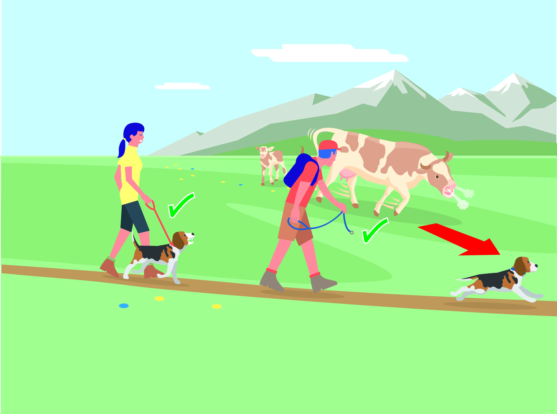 If you decide to cross alpine pastures or meadows with your dog, you do so at your own risk and you must exercise heightened caution. Before hiking with your dog, you should determine whether you will have to cross a meadow or pasture along the route, and whether or not you might be able to avoid it completely.