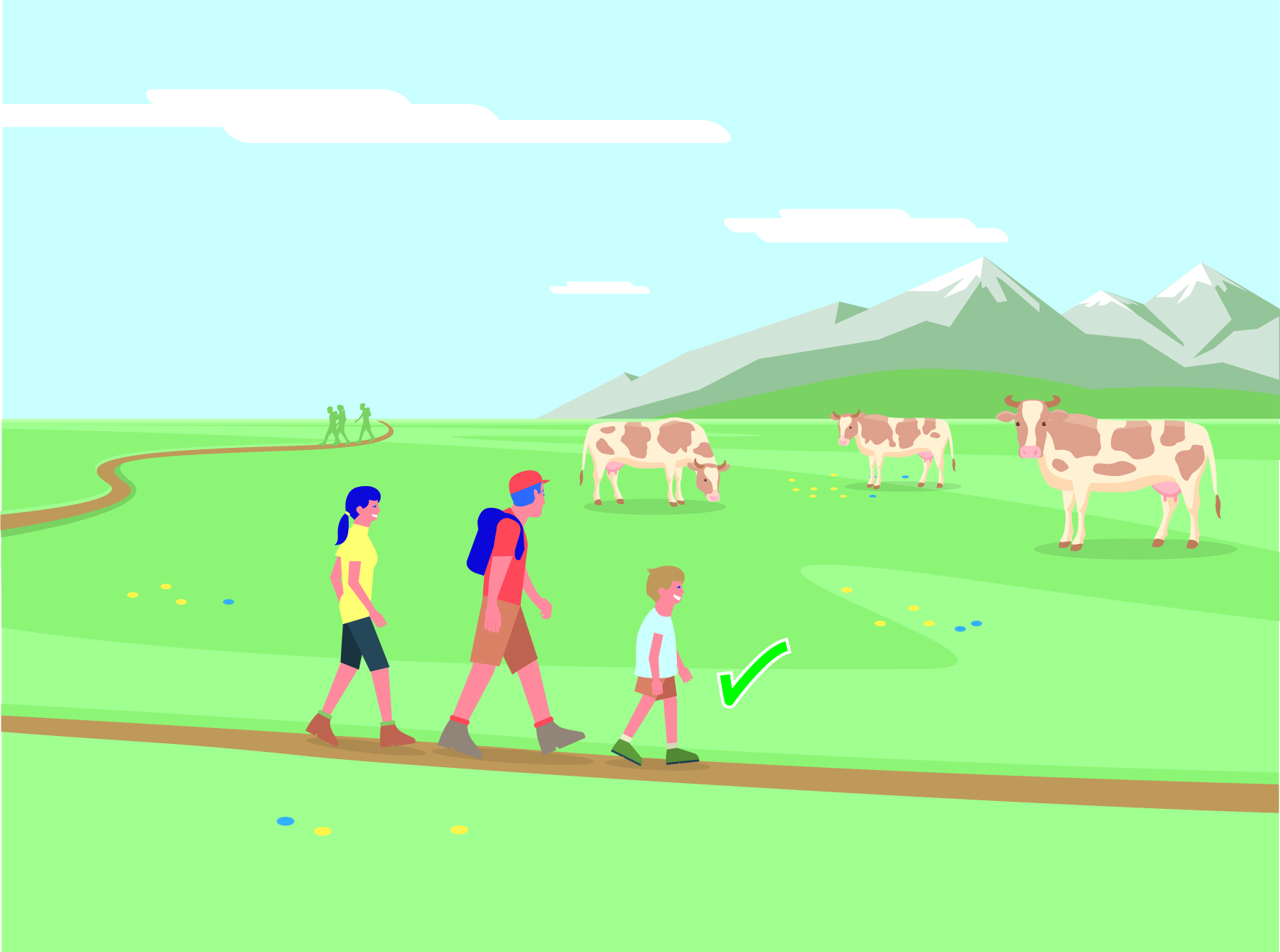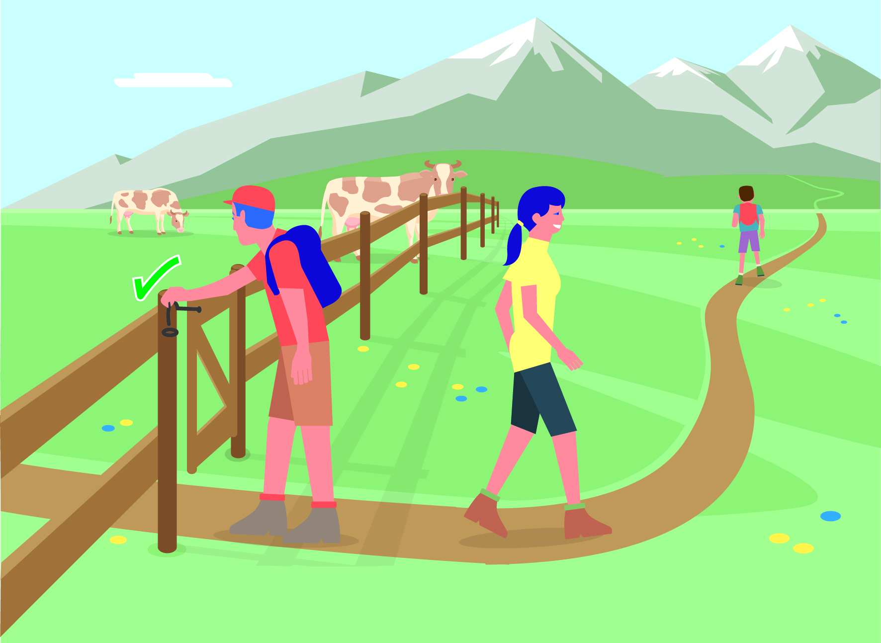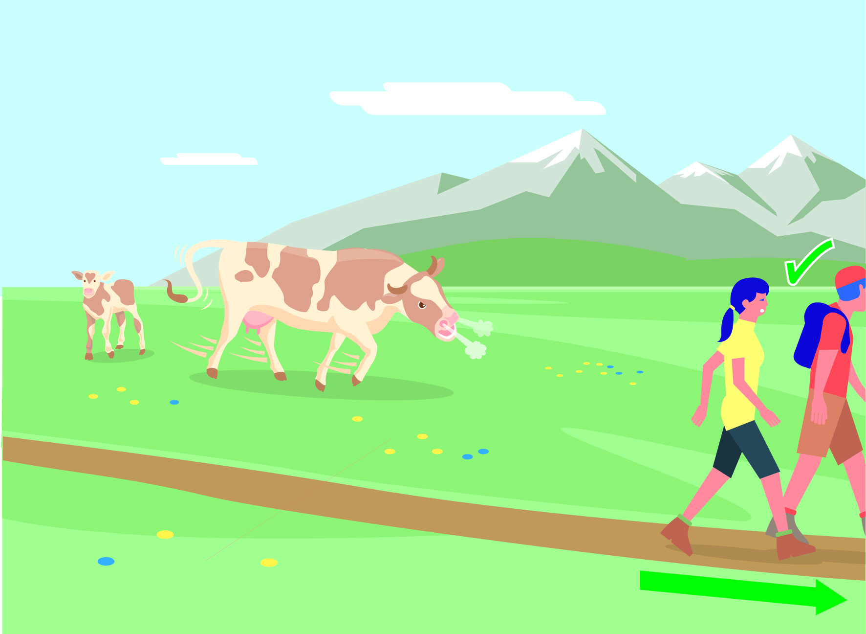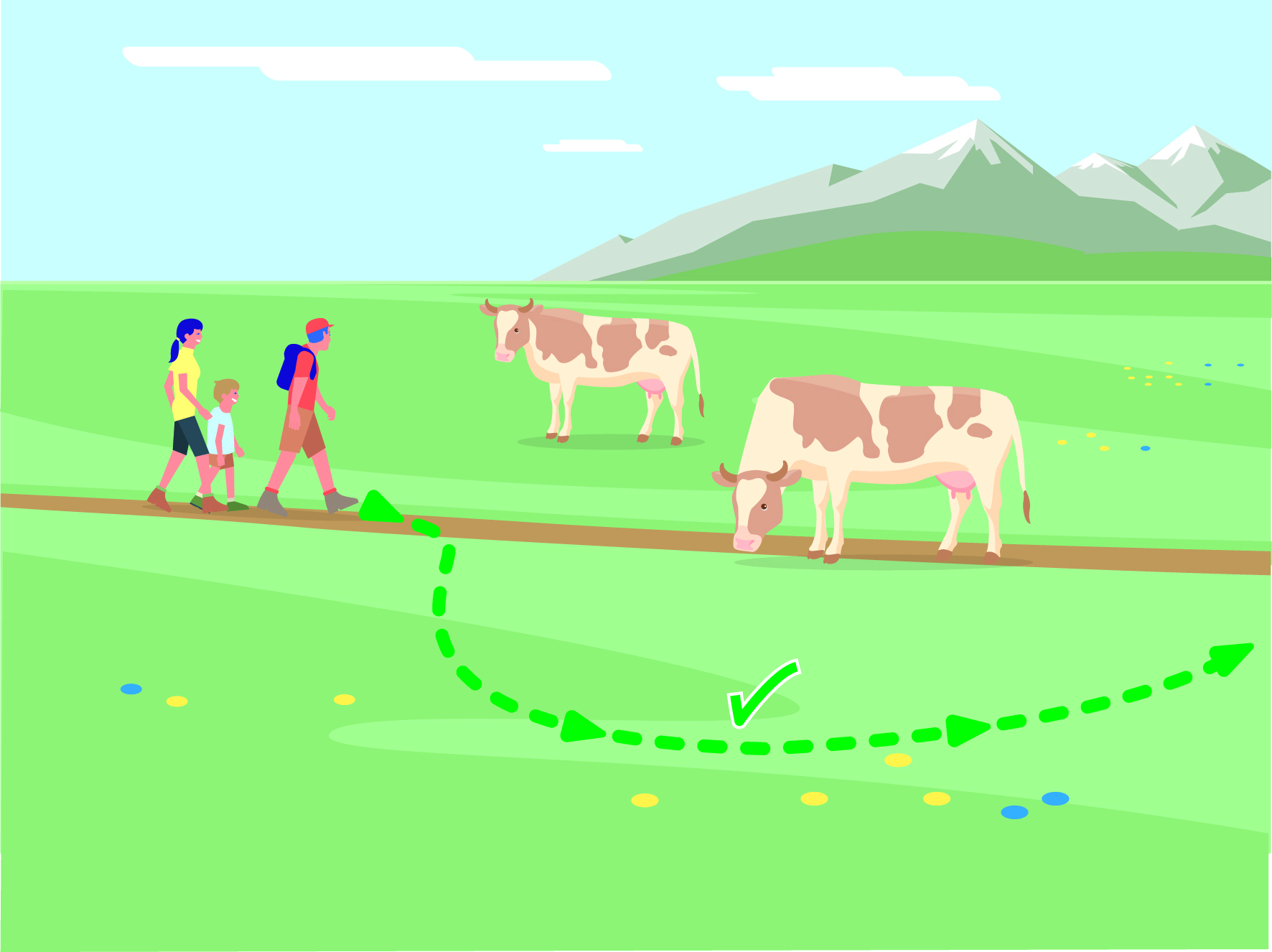 Be aware of fences and gates. If there is a gate, use it, closing it firmly behind you and crossing the meadow quickly. As a hiker or mountain biker, never leave the marked paths. If you encounter a herd of cows, circle them at a distance of 30 to 50 meters, ideally above the herd. Avoid going straight through the middle of the herd if at all possible. If animals block the path, detour them at the greatest distance possible (30 - 50 meters). If cows approach you: Remain calm, don’t turn your back on them and leave the meadow. Observe the animals without making direct eye contact: if you notice they are becoming restless, leave the pasture or grazing area immediately – do not run away. Instead, make your retreat without taking your eyes off the animals!
