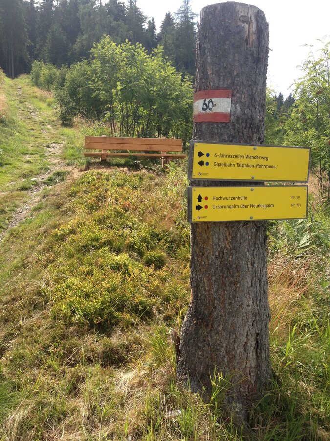 From Hochwurzen summit, we make our way to the Hochwurzenalm, which lies just a little below. The path leads through fairytale alpine high forest – if we are lucky, we might catch sight of one of the animals that live here! In a series of broad switchbacks, our path meanders downhill on the Preunegg valley side of the Hochwurzen, until we meet up with trail No. 771, which leads to the Neudegg- and Ursprungalm. We follow this path ro the right towards the mouth of the valley, until we reach the Hochwurzen road. After about 200 meters, we will come to Gasthof Winterer. If we want, we can continue our hike – the path is marked all the way back to the valley terminal of the Gipfelbahn Hochwurzen cable car (trail n° 60) or along the Rohrmoosstraße road (suitable for prams).
