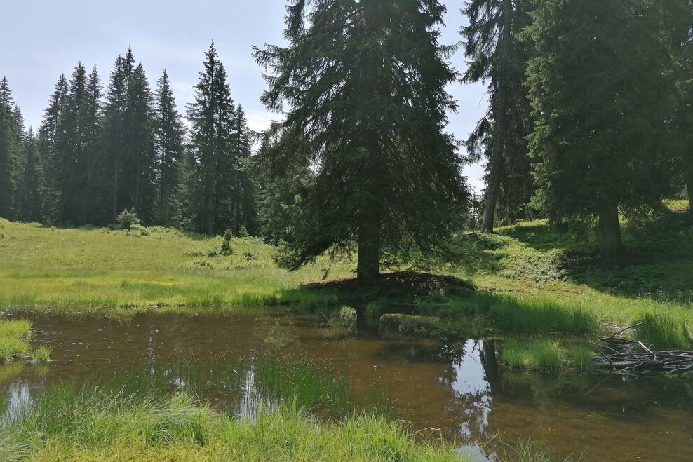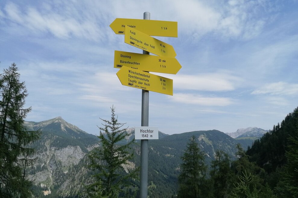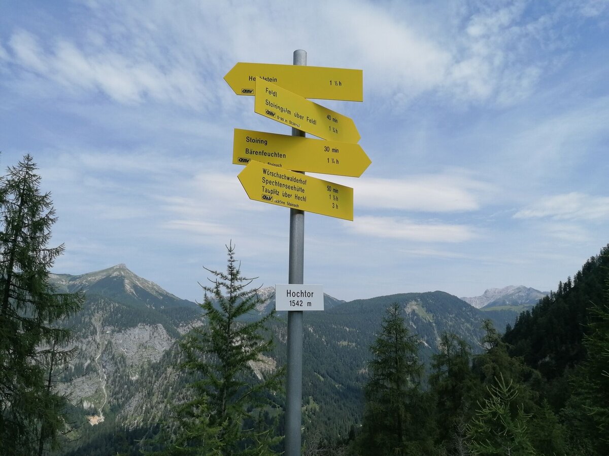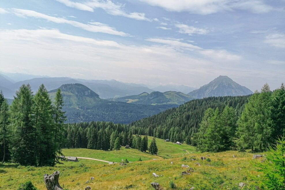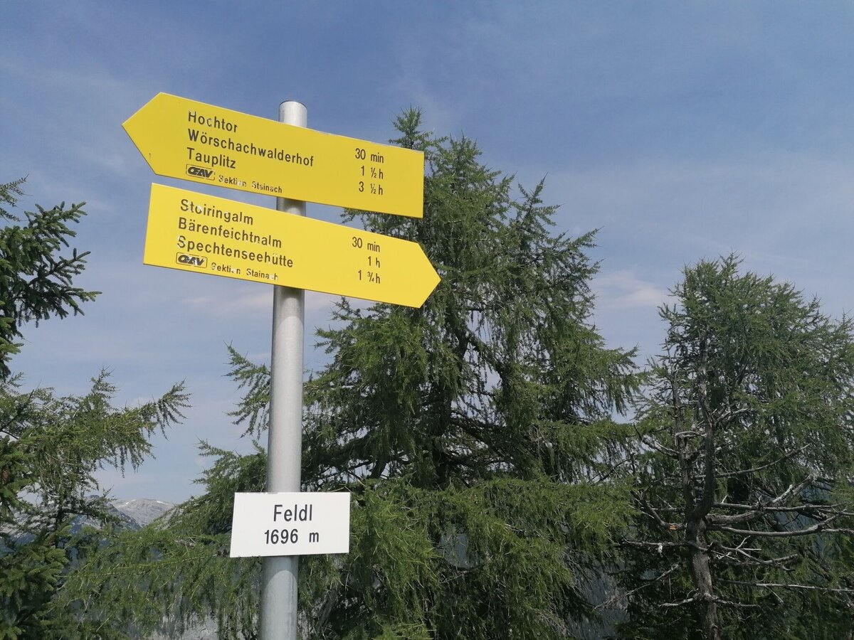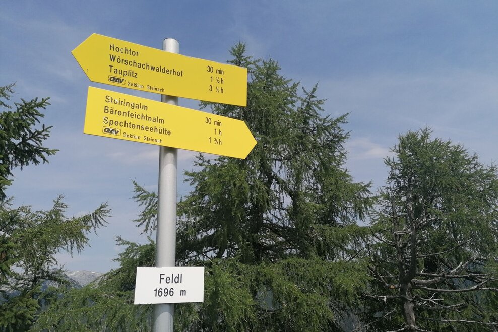 The tour starts at the parking lot of the Spechtensee hut. Turn right and continue to the Mojer farm and take the marked forest path up to the Stoiringalm. Turn right and walk along the forest path to the last hut. Behind it, turn left on the forest path and follow the path up to the Feldl. The summit cross and the bench at the top invite you to take a rest. A fascinating view of the surrounding mountains, including Hochmölbing, Hochtausing, Hechelstein and Grimming. Continue west and follow the markings via Hochtor down to Wörschachwalderhof. Via the forest path to the idyllic Spechtensee and back to the starting point.