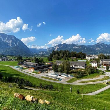 We are now cycling along the Enns again. In sight of the village of Fischern we cross over to the other side - in a left turn we continue on unpaved ground through the Rosswiesen (in the direction of the golf course), and at the road turn left and cross the bridge. Before the road turns half-left under the railroad to Weißenbach, we keep straight on and follow the signs to Liezen. Welcome to the district capital of Austria's largest district in terms of area.