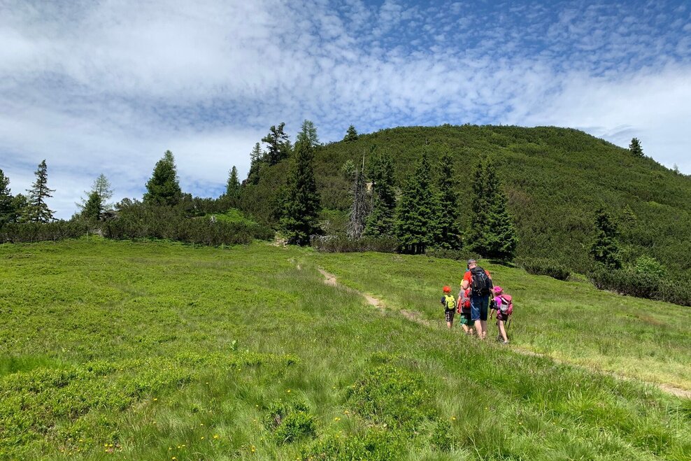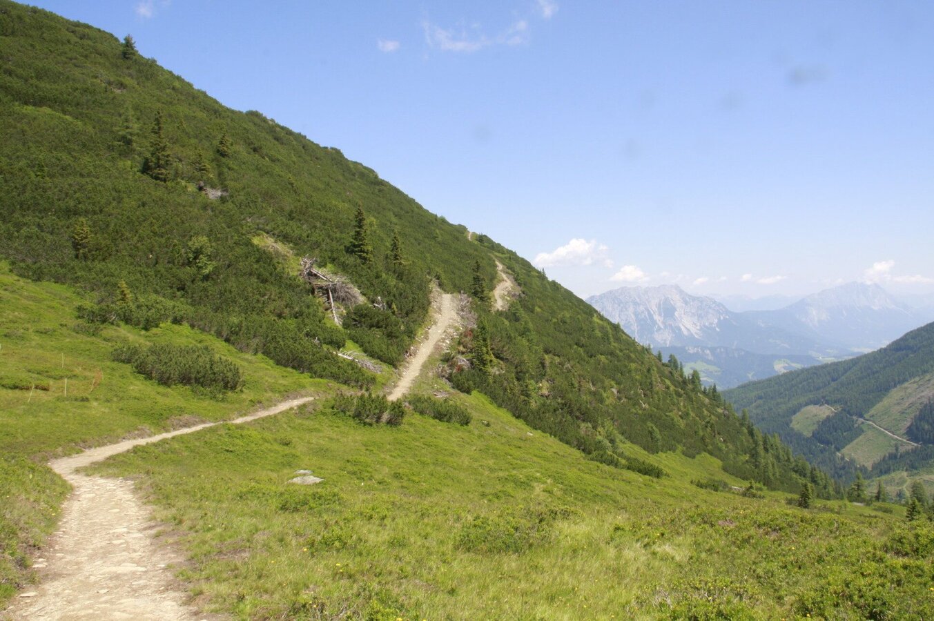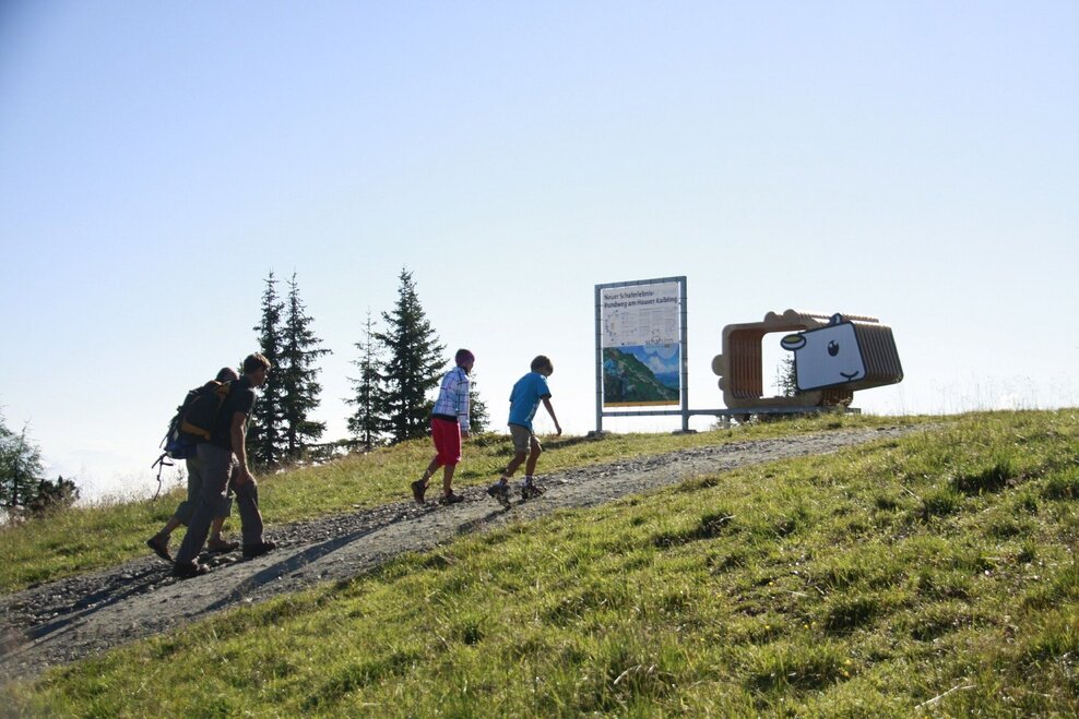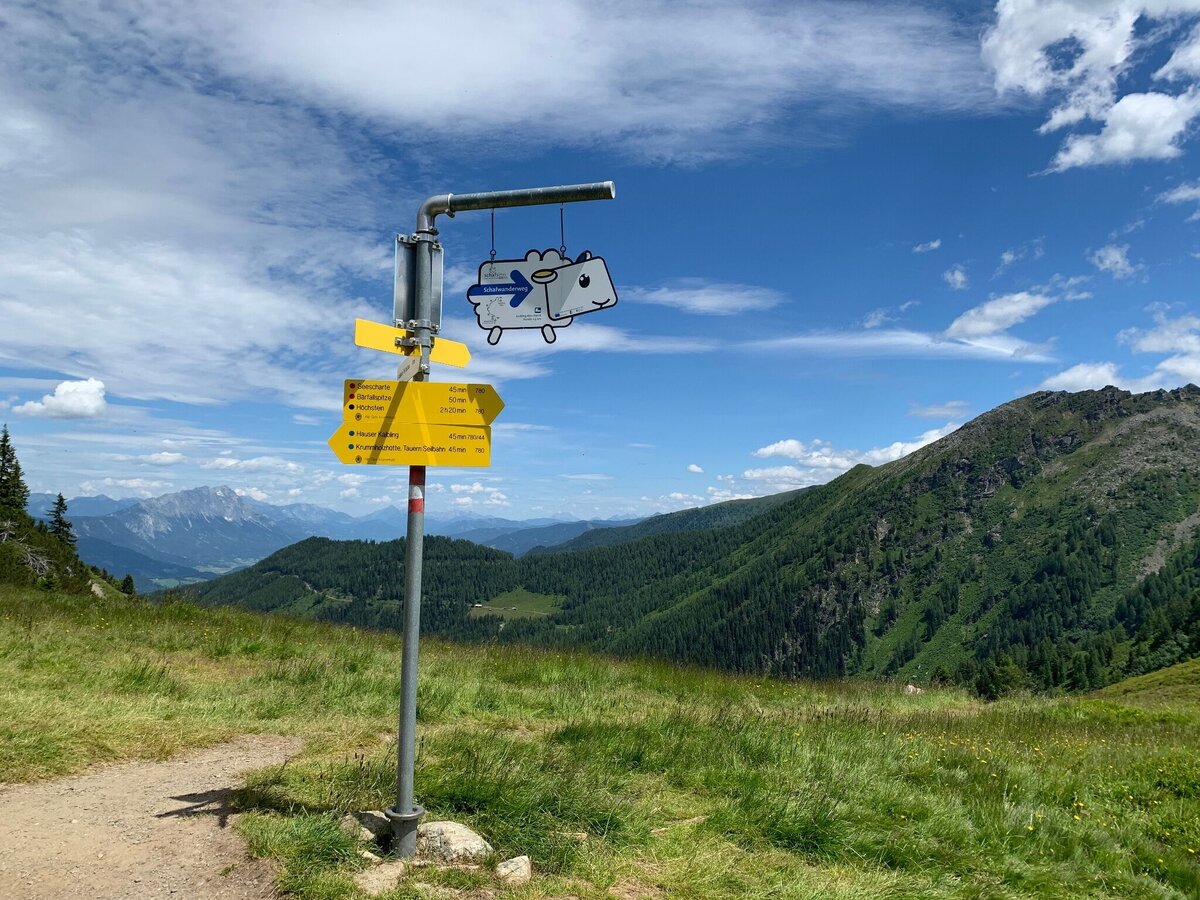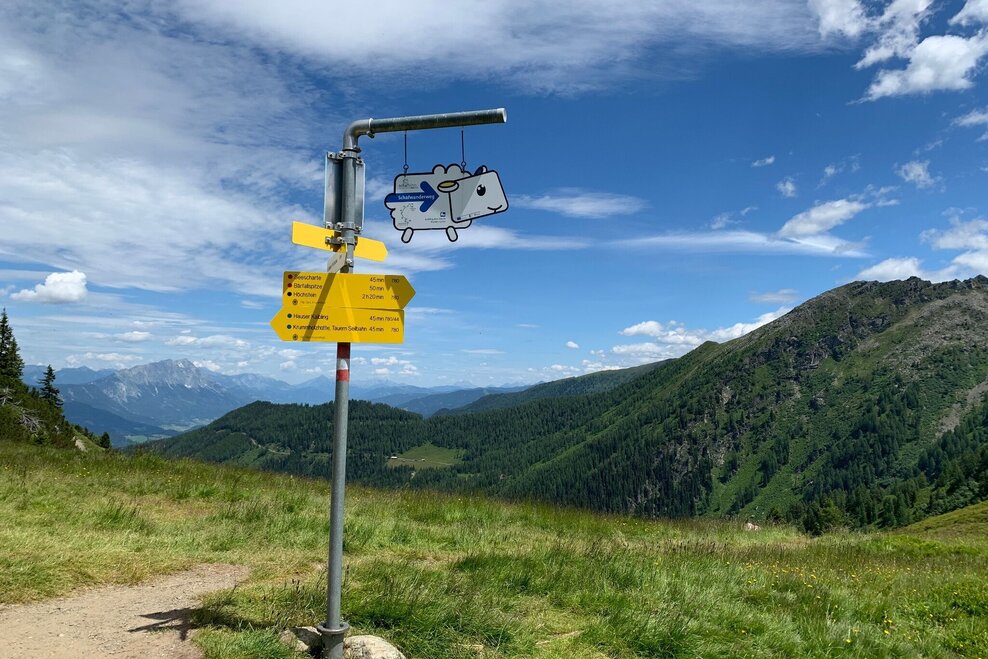 The great difference in altitude can be comfortably overcome with the Schladminger Tauern cable car or the Hauser Kaibling 8-seater gondola lift & the Kaiblinggrat 8-seater chairlift. A magnificent view over the entire upper Enns Valley awaits us. From the mountain station, we walk slightly uphill for a few minutes, where the Schafsinn circular trail branches off to the left at the TV station in an easterly direction. There we soon see the large “Schafbox”, the actual starting point of the circular trail. This is signposted throughout and then leads slightly up and down in a clockwise direction around the Hauser Kaibling to the Rossfeldsattel. From there, the trail descends gently to the Kaiblingalm. This is easily accessible for families with baby carriages from the other side via the forest path, which also takes you back to the cable car mountain station.