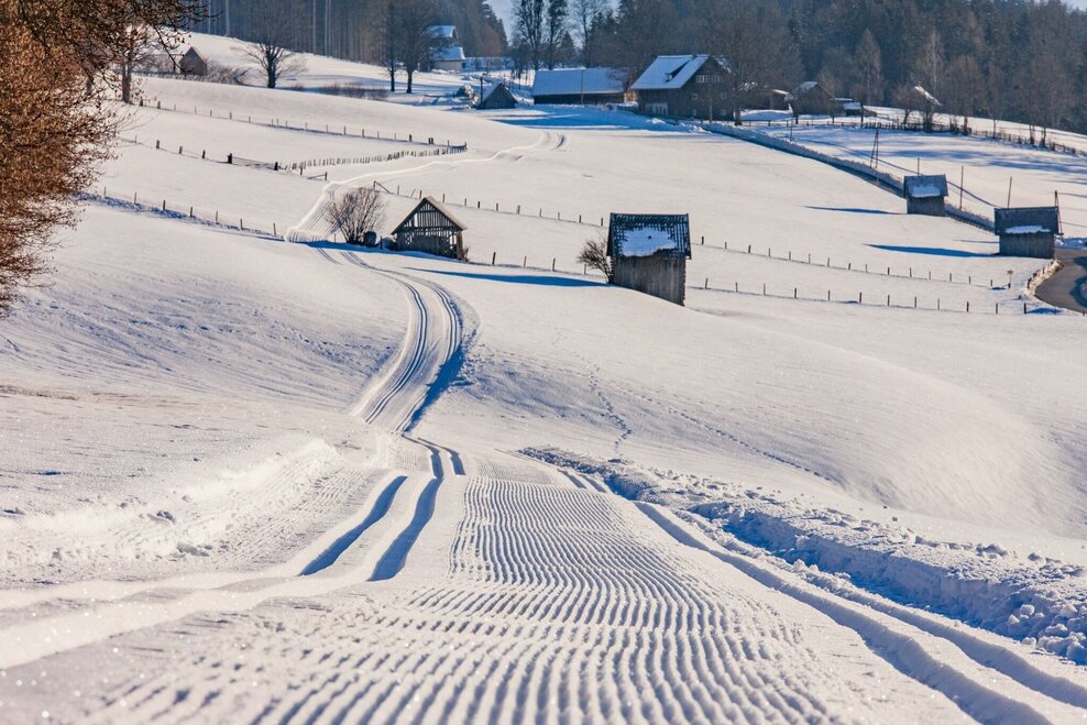 For sun lovers we recommend the sunny cross-country trail on the Birnberg plateau. Dense spruce forests followed by clearings and meadows, intact nature and silence await the connoisseur. - IMPORTANT: The trails are only groomed when there is sufficient natural snow!