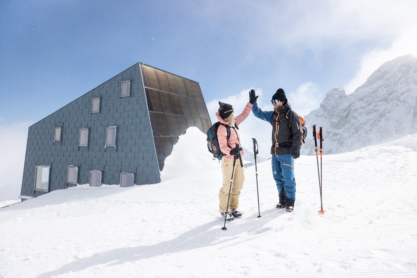 Descent from the Dachstein mountain station to below the Dirndl via the groomed and marked trail. Ski up and follow the trail in a long left-hand bend past the shoulder ascent - which leads to the Dachstein summit - to the Seethalerhütte. The hut, which was significantly redesigned in 2018, is located between the Dirndl and the Hoher Dachstein directly on the south face of the Dachstein. Return as outward route.
