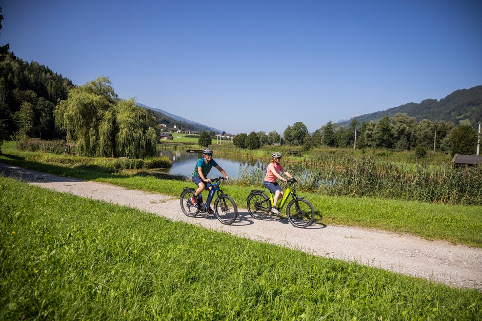 Some of the highlights of the Enns bike path, in brief: The start at almost 1,000 metres above sea level at the foot of the Niederen Tauern in Flachauwinkel. The impressive mountains and numerous bathing lakes. The historic towns of Radstadt and Schladming with their lively sporting attractions. The impressive Grimming, long considered the highest mountain in Styria, and at its feet Trautenfels Castle with its wonderful exhibitions on culture and nature. A few kilometres further on is the Admont Monastery at the entrance to the Gesäuse National Park with the largest Sifts library in the world. And of course the old trading town of Steyr and Austria's oldest town of Enns. Between the two stations, the Enns forms the natural border between Upper and Lower Austria.