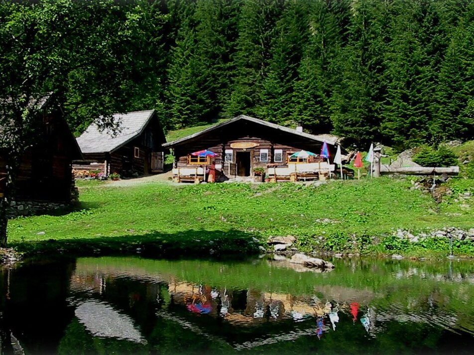 You walk down to the wooden bridge, cross over to the other shore and then continue on the trail leading you out of the valley on the other side. It is only a couple of minutes until you reach the Eschachalm chalet, where you have earned yourself a cake and a cup of coffee.