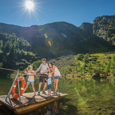 From the Preunegg Jet top station, a half-hour hike in the direction of Mirror Lake brings you to the starting point, just above the hiking path next to a bench.