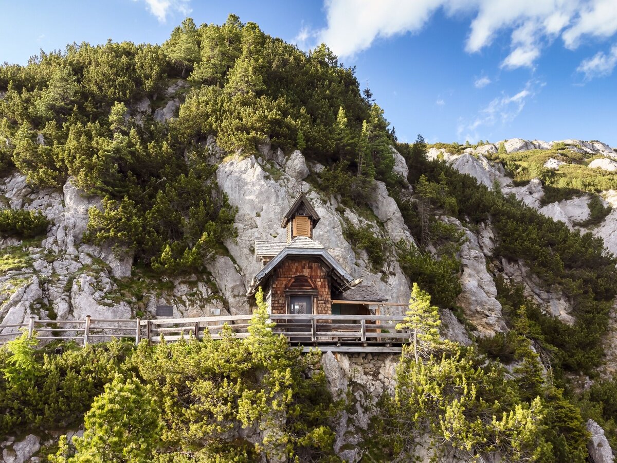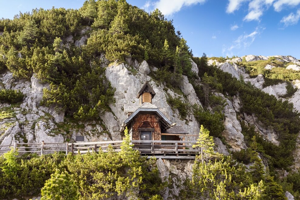 At the crossroads next to the Stoderhütte, the trail branches off to the summit and to the Friedenskirchlein, which can be reached in about 20 minutes. Narrow and close to the rock, this beautiful path leads to the little church, which hangs in the rocks like an eagle's nest and offers a magnificent view. Built in memory of the pioneer of the Stoderzinken, Emil Ritter von Horstig, it has now become a much-visited vantage point.