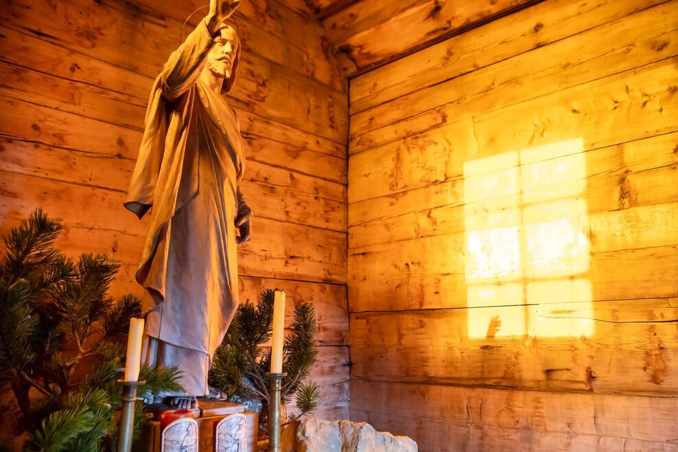 Even the ascent on the Stoderzinken Alpenstraße is an experience. Especially in the last third, where the road hugs the rocks and leads to the starting point. During the short hike from the Rosemi Alm to the Alpengasthof Steiner, we get our first glimpse of the Dachstein Glacier high above the forest. A beautiful, narrow path leads directly along the rocks to the chapel, which sits enthroned on the summit like an eagle's nest and offers a wonderful view over the Ennstal and to Gröbming and Aich-Assach.