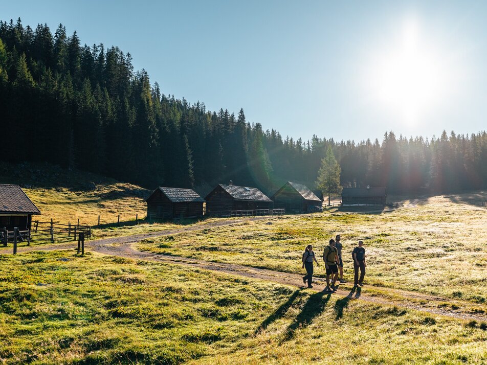 From Gasthof Steiner on the Stoderzinken, we follow the dirt road to the Brünnerhütte. A beautiful larch forest interspersed with pine surrounds narrow path No. 618, which we follow for the better part of an hour through the Brandner Urwald. In the valley bottom below the Kimpflingsattel, we branch off to the Notgasse. We need to pay close attention, since the markings are easy to miss. Big clearings, such as the Wiesmahd, occasionally interrupt the dense forest. It was here, in former times, that charcoal was produced. In the narrow, some 550 m long and up to 30 m wide rocky canyon of the Notgasse, it is not rare for snow to be on the ground until well into summer. Because of the rock drawings discovered there, the Notgasse is protected as an important cultural site – so please take that into consideration! After this ancient trade route, we come to a new forestry lane, which we follow to the Brandalm – from there now along the Bettlersteig trail to a beautiful hut village at the Viehbergalm. Following trail No. 28, we descend about 300 m as far as the Rahnstube, where we again meet up with that forestry lane from the Brandalm. We continue through flat terrain until a beautiful path through the impressive Öfen brings us to Gröbming Winkl.