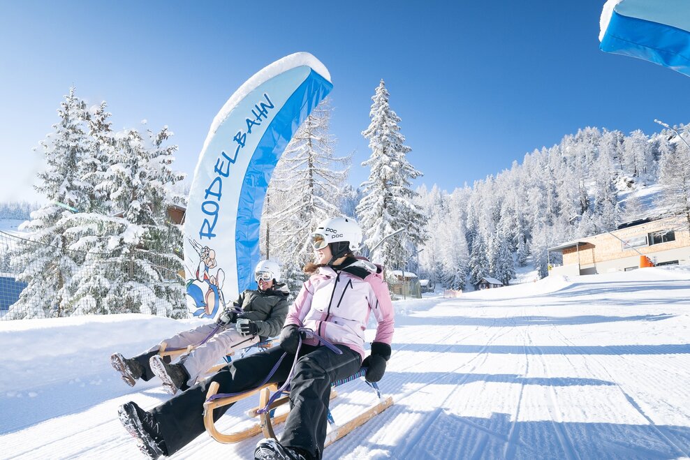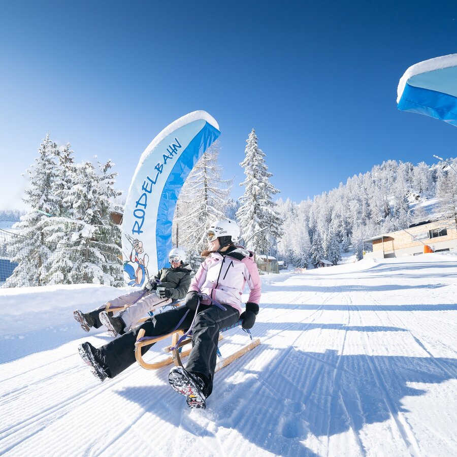 The toboggan run starts at the GUB mountain station and leads over a winding 5 km back to the GUB valley station.